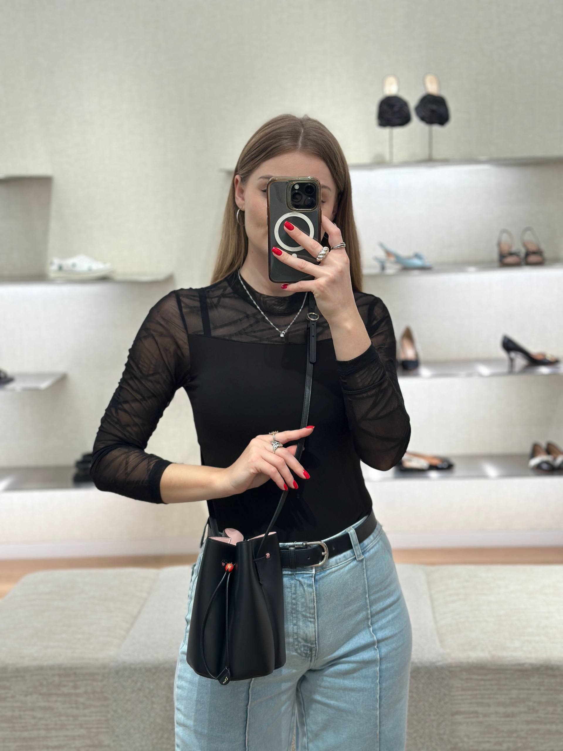Стильный женский образ в стиле casual. В центре внимания — черная сумка-ведро (bucket bag) из гладкой кожи с длинным регулируемым ремешком и деликатным логотипом бренда. Верх состоит из черного полупрозрачного сетчатого лонгслива с абстрактным принтом, надетого поверх базового черного топа. Низ представлен светло-голубыми джинсами прямого кроя с акцентным вертикальным швом и черным кожаным ремнем с серебристой фурнитурой. Состав сумки: 100% натуральная кожа. Состав лонгслива: 92% полиамид, 8%