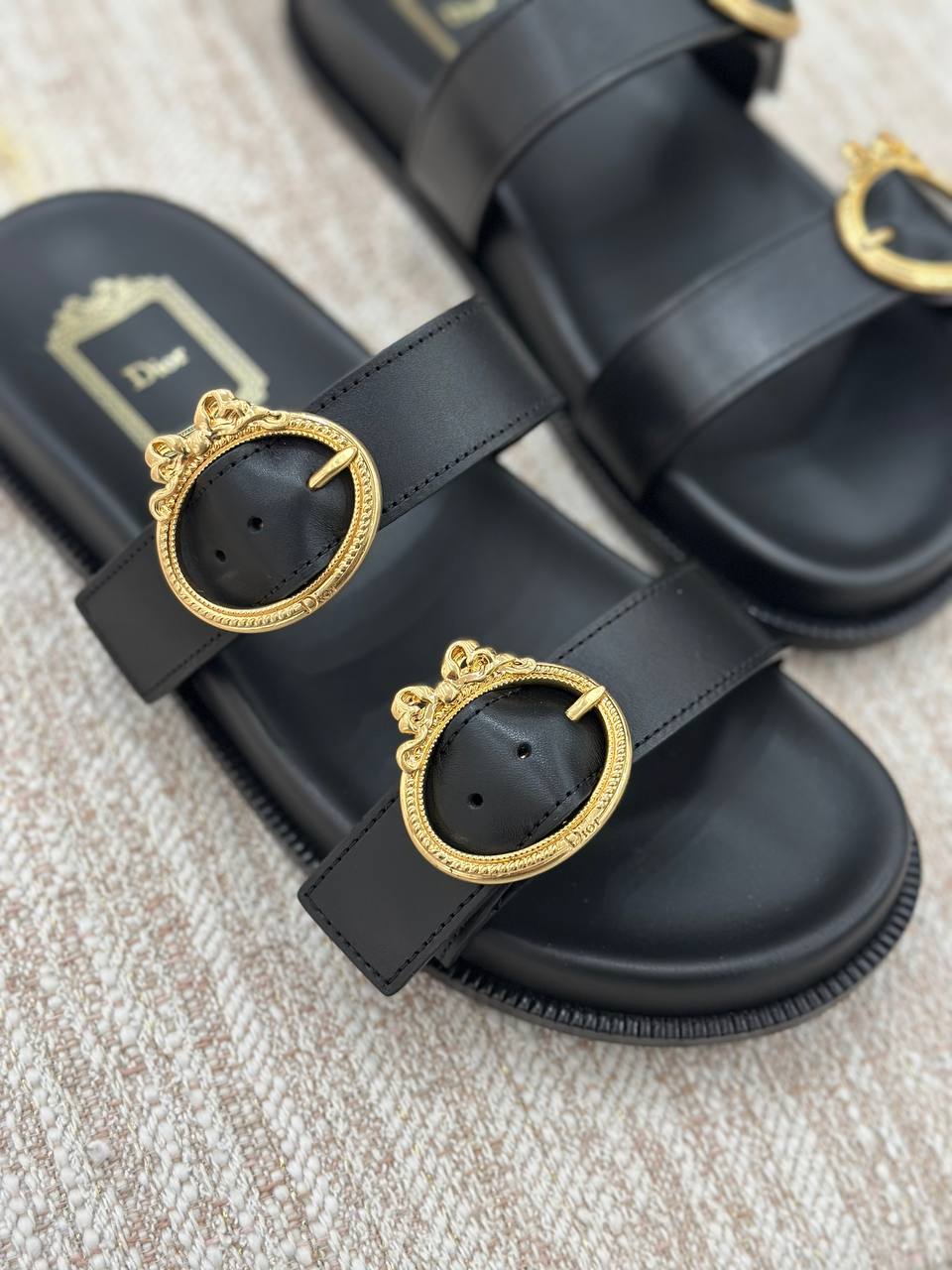 Элегантные женские шлепанцы Dior, выполненные из гладкой натуральной кожи черного цвета. Модель отличается лаконичным фасоном с двумя широкими ремешками, которые украшены массивными декоративными пряжками золотистого цвета с изящной гравировкой и бантом. На стельке расположен фирменный логотип бренда. Состав: 100% натуральная кожа, металлическая фурнитура.