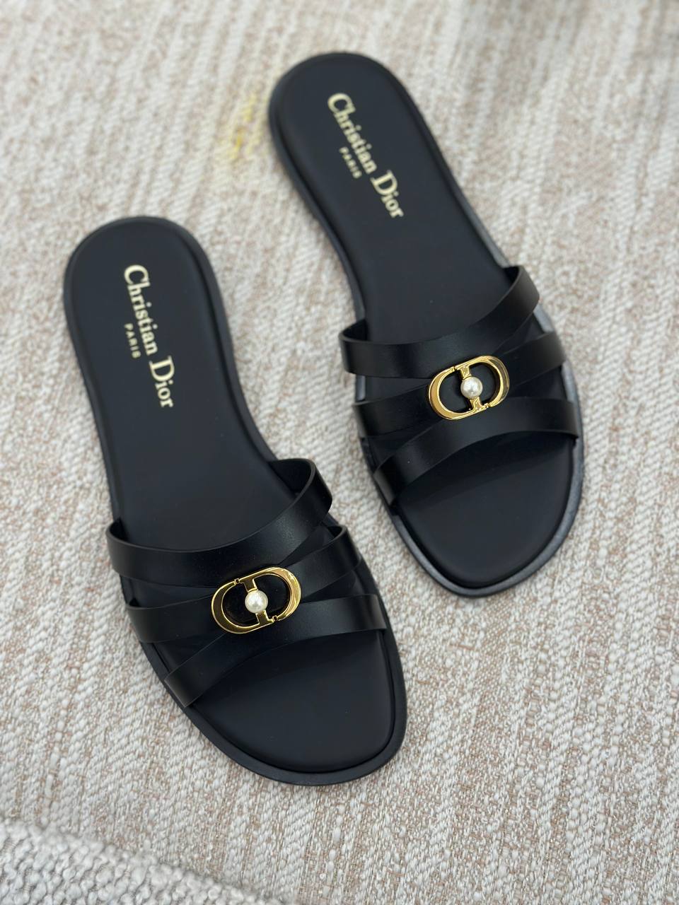 Элегантные женские шлепанцы Christian Dior черного цвета. Модель выполнена из высококачественной натуральной кожи. Дизайн верха представлен перекрещивающимися ремешками, которые декорированы золотистой пряжкой с логотипом CD и жемчужной вставкой в центре. На стельке расположено фирменное тиснение бренда. Плоская подошва обеспечивает максимальный комфорт. Состав: 100% кожа.