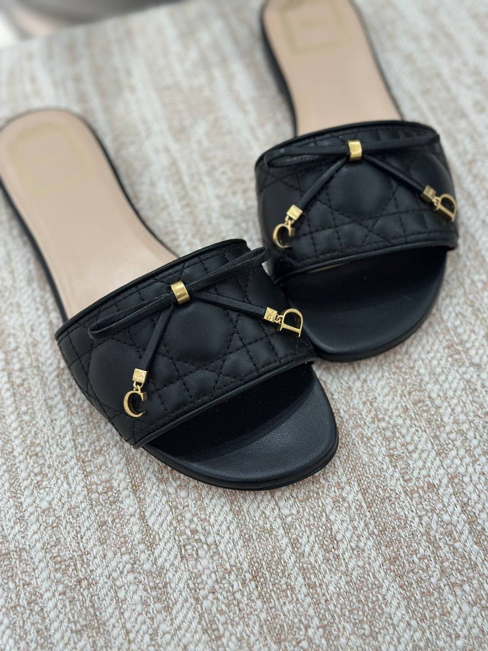 Элегантные женские шлепанцы из натуральной кожи черного цвета. Верхняя часть украшена фирменной стежкой, декоративным тонким бантом и золотистыми металлическими подвесками в виде букв логотипа ‘C’ и ‘D’. Модель с открытым мысом на плоской подошве дополнена контрастной бежевой стелькой. Состав: 100% кожа.