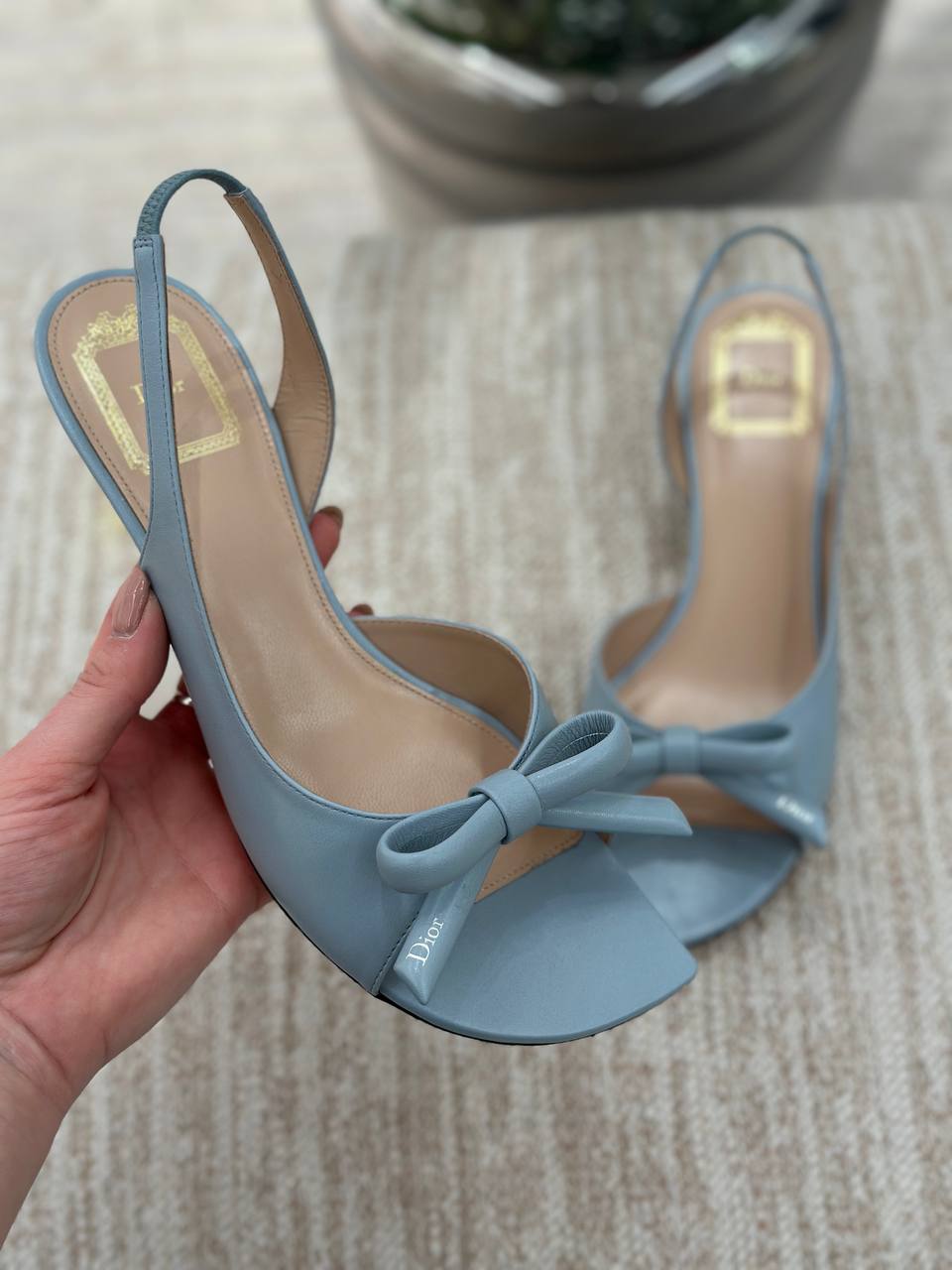 Элегантные женские туфли-слингбэки в нежно-голубом цвете. Модель выполнена из мягкой натуральной кожи и декорирована аккуратным бантом на передней части с логотипом Dior. Обувь имеет открытую пятку с эластичным ремешком и изящную стельку с фирменным золотистым тиснением бренда. Классический фасон с утонченным дизайном идеально подходит для создания женственных образов. Состав: 100% натуральная кожа.