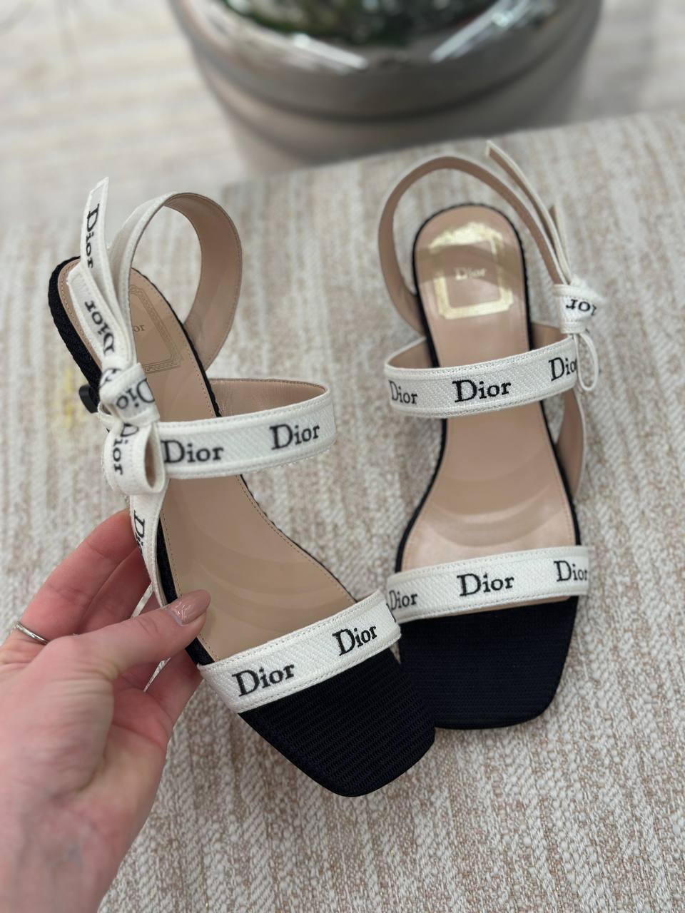 Элегантные женские босоножки Dior с открытым квадратным мысом. Модель выполнена в контрастном черно-белом цвете. Текстильные ремешки украшены узнаваемой вышивкой с логотипом бренда Dior. Дизайн дополнен изящным невысоким каблуком и декоративным бантом на ремешке вокруг пятки. Состав: текстиль, натуральная кожа.