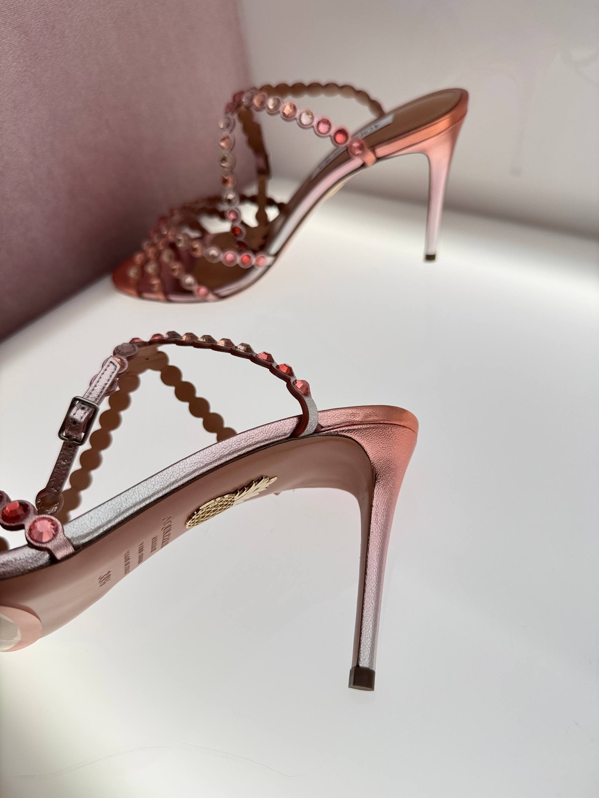 Элегантные босоножки на высоком каблуке-шпильке от бренда Aquazzura. Модель выполнена в цвете розовое золото с эффектом металлик. Изящные фигурные ремешки декорированы крупными сверкающими кристаллами розового цвета. Обувь фиксируется тонким ремешком с миниатюрной пряжкой. На подошве расположен фирменный золотистый логотип в виде ананаса. Состав: 100% кожа, отделка кристаллами.
