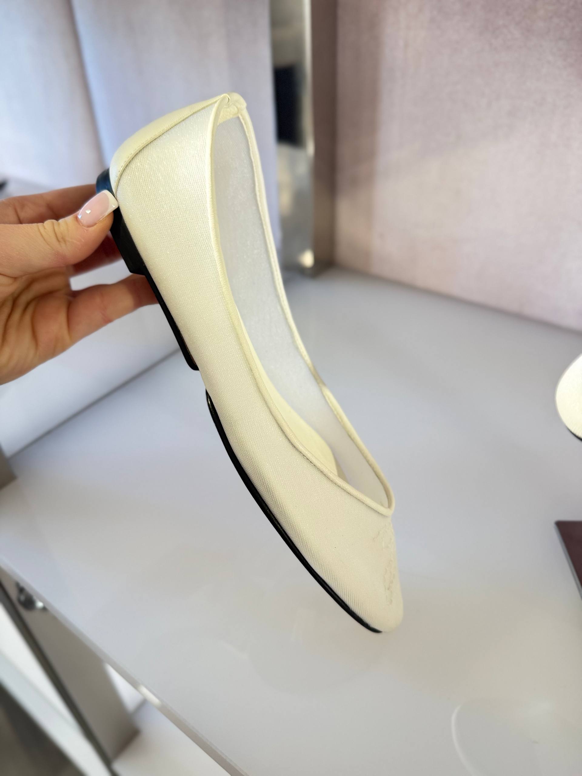 Элегантные женские балетки молочного цвета, выполненные из плотного текстиля с легким сатиновым блеском. Модель с зауженным мысом дополнена деликатной вышивкой логотипа в тон изделия. Тонкая контрастная подошва черного цвета подчеркивает изящный силуэт. Состав: верх — 100% текстиль, подкладка — 100% натуральная кожа, подошва — 100% кожа.