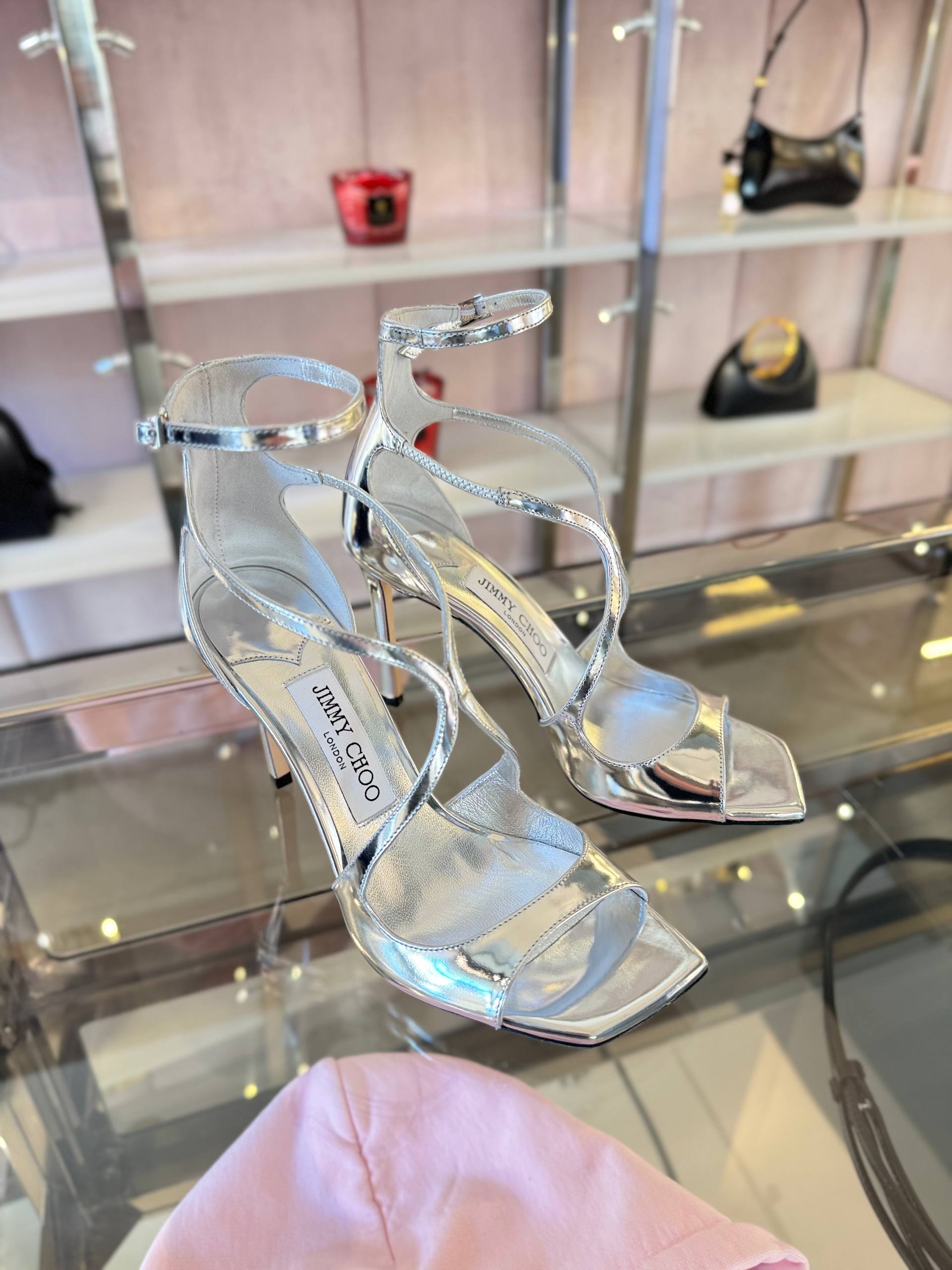 Элегантные женские босоножки Jimmy Choo, выполненные из металлизированной кожи серебристого цвета. Модель отличается открытым квадратным мысом и тонкими изящными ремешками, которые перекрещиваются на подъеме и фиксируются на щиколотке тонким ремешком с миниатюрной пряжкой. Высокий каблук-шпилька придает силуэту особую утонченность. На внутренней стельке нанесен логотип Jimmy Choo London. Состав: 100% натуральная кожа.