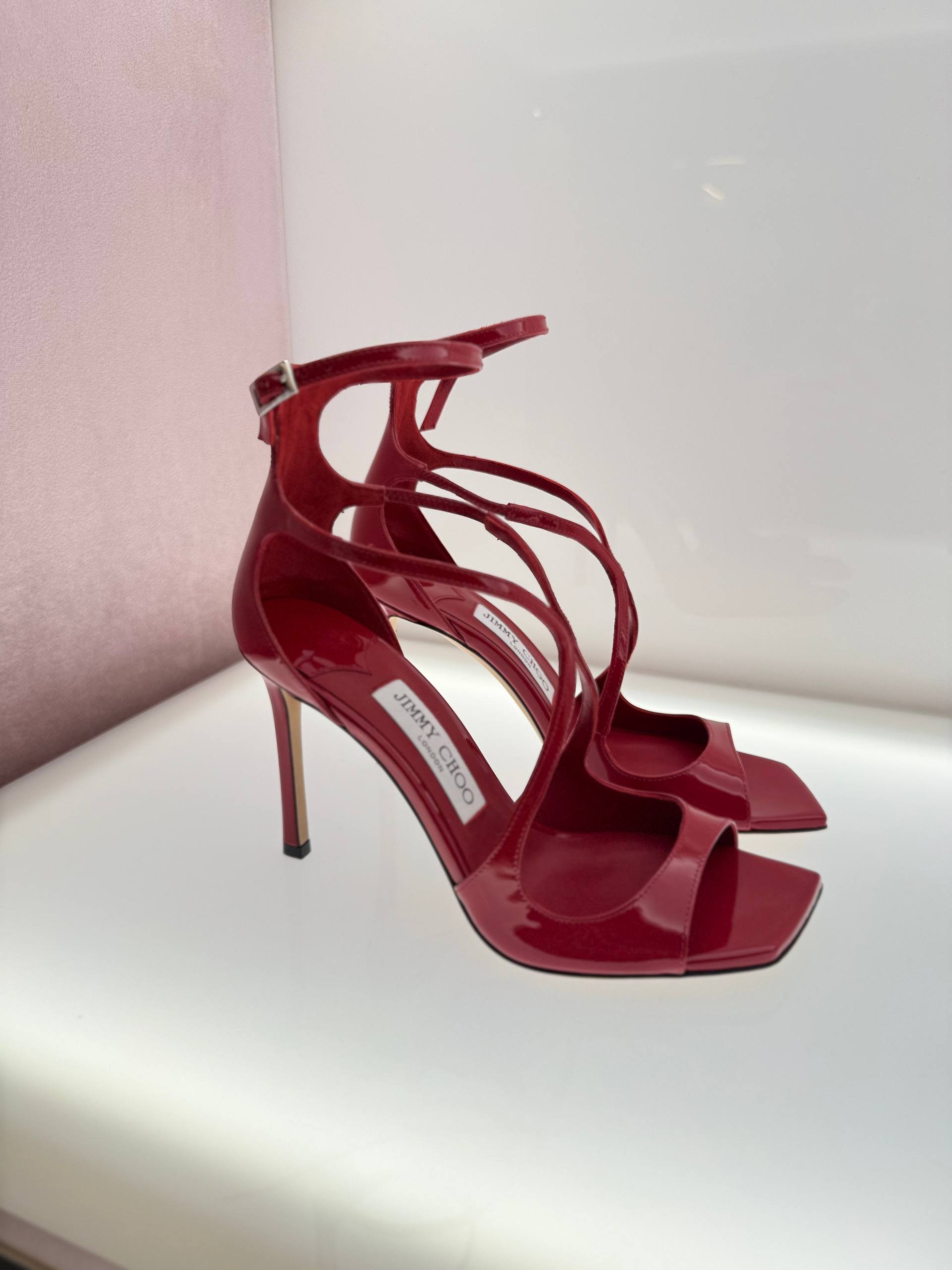 Элегантные женские босоножки Jimmy Choo из ярко-красной лакированной кожи. Модель отличается открытым квадратным мысом и множеством тонких переплетающихся ремешков, которые переходят в регулируемый ремешок на щиколотке с миниатюрной серебристой пряжкой. Высокий тонкий каблук-шпилька придает образу особую утонченность. На внутренней стельке нанесен фирменный логотип бренда. Состав: верх — 100% лакированная кожа, подкладка и подошва — 100% натуральная кожа.