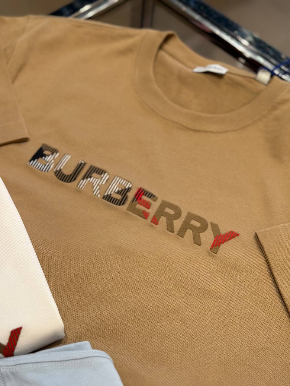 Мужская футболка Burberry песочного цвета. Модель прямого фасона с короткими рукавами и классическим круглым вырезом горловины. На груди расположена крупная вышивка логотипа бренда, выполненная в фирменной расцветке клетки Nova Check. Изделие выполнено из качественного трикотажа. Состав: 100% хлопок.