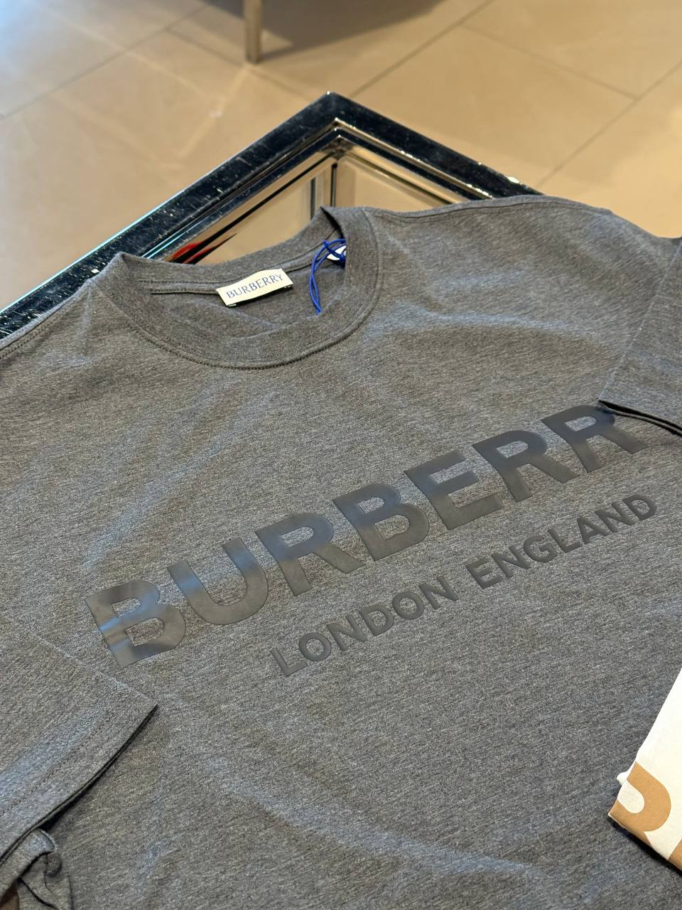 Классическая мужская футболка Burberry серого цвета с меланжевым эффектом. Изделие прямого кроя с короткими рукавами и круглым вырезом горловины. На груди расположен крупный прорезиненный принт с логотипом бренда ‘BURBERRY LONDON ENGLAND’. Состав: 100% хлопок.