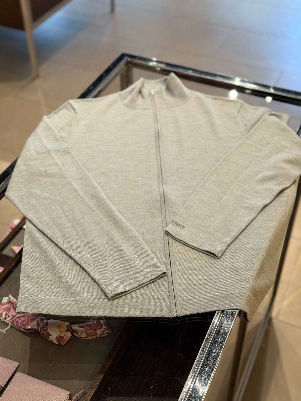 Мужской тонкий трикотажный кардиган светло-серого цвета. Модель прямого кроя дополнена застежкой на молнию и воротником-стойкой. На манжете рукава расположен лаконичный логотип бренда Burberry. Изделие выполнено из мягкой 100% шерсти мериноса.