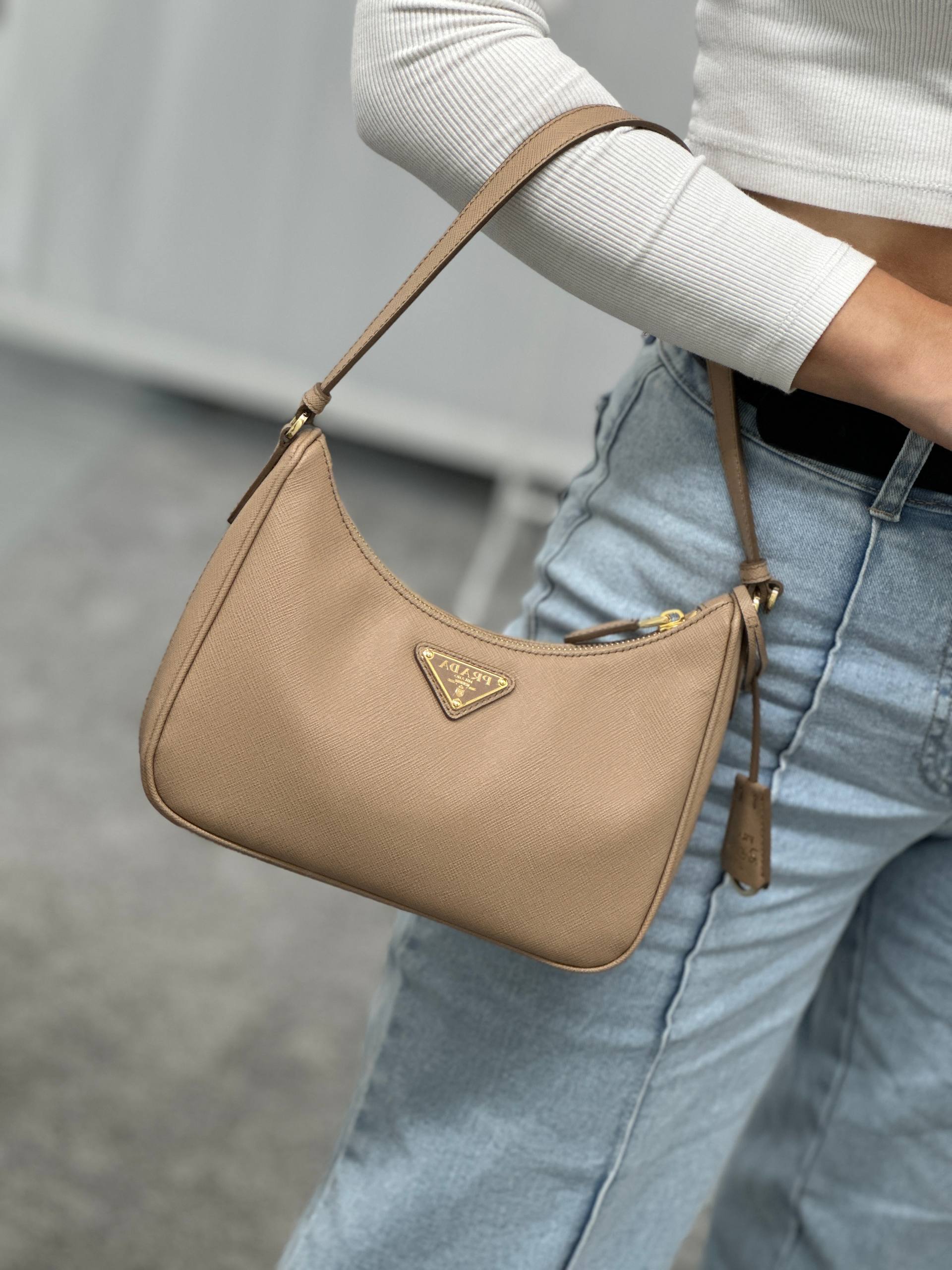 Стильная женская сумка-хобо бежевого цвета, выполненная из фактурной кожи с тиснением Saffiano. Модель отличается компактным размером и лаконичным дизайном, дополнена золотистой фурнитурой и фирменным треугольным логотипом на лицевой панели. Сумка оснащена одной кожаной ручкой для ношения на плече или в руке и застегивается на молнию. Состав: 100% натуральная кожа, текстильная подкладка, металлическая фурнитура.