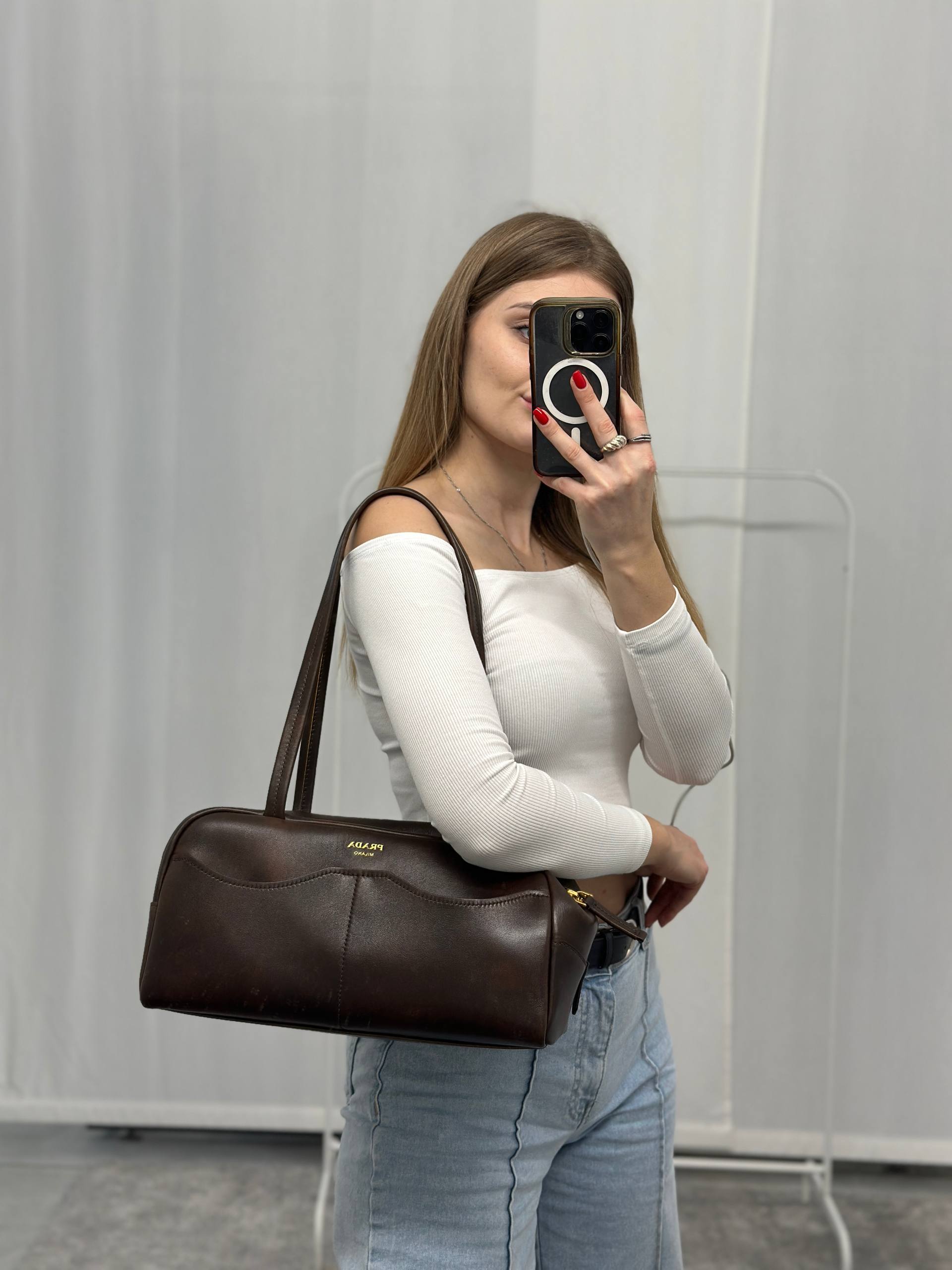 Элегантная женская сумка в глубоком темно-коричневом цвете. Модель выполнена в прямоугольной форме с закругленными углами и дополнена длинными тонкими ручками для комфортного ношения на плече. Передняя панель декорирована фигурной строчкой и золотистым логотипом Prada Milano. Лаконичный дизайн и качественная фурнитура делают этот аксессуар универсальным дополнением к классическому гардеробу. Состав: 100% натуральная кожа.