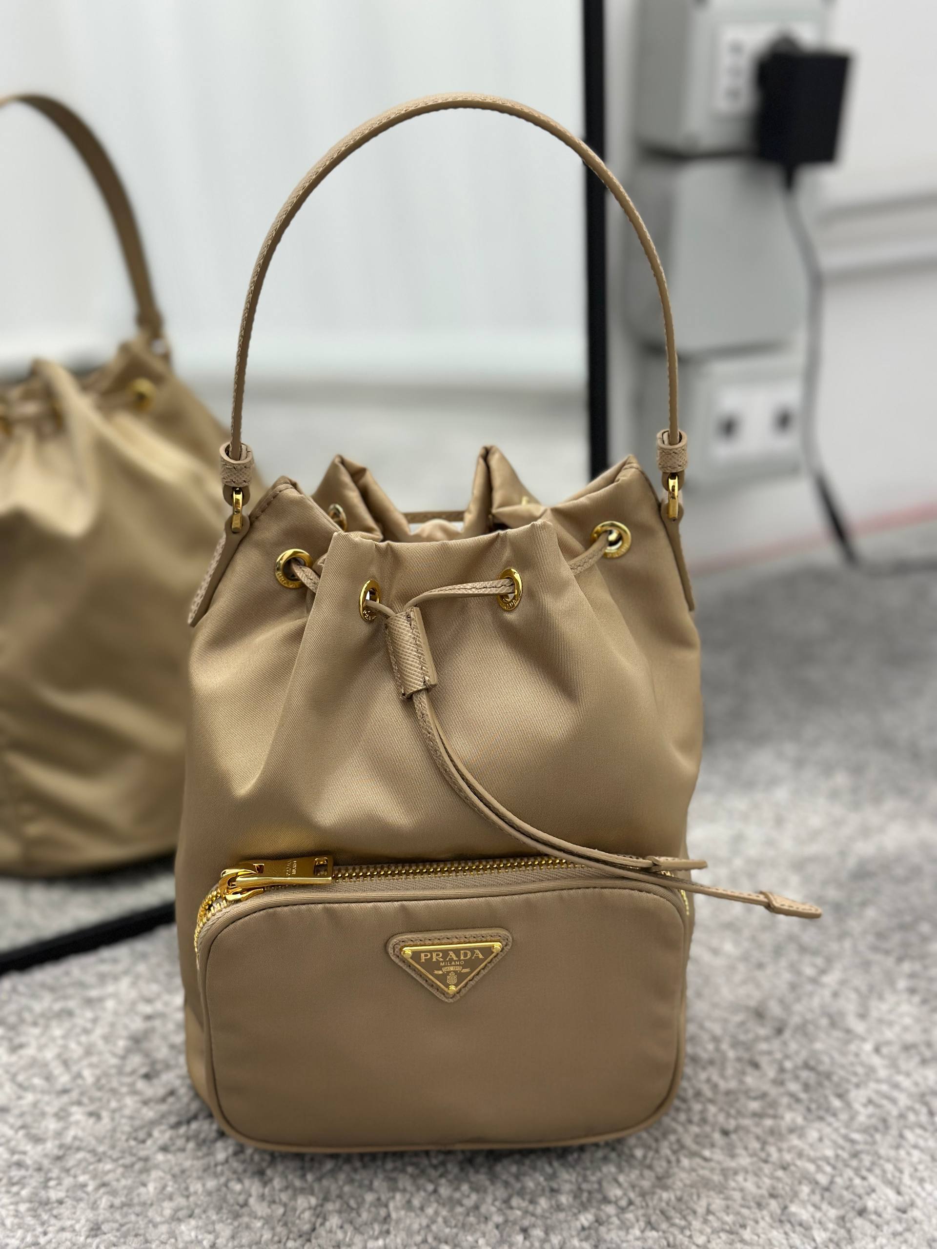 Стильная сумка-мешок Prada бежевого цвета выполнена из прочного нейлона. Модель с одной ручкой сверху затягивается на шнурок. На передней части расположен функциональный накладной карман на золотистой молнии, украшенный культовым эмалированным треугольным логотипом бренда. Качественная фурнитура золотистого цвета дополняет изысканный образ. Состав: 100% нейлон, отделка из натуральной кожи Saffiano, фурнитура из металла.