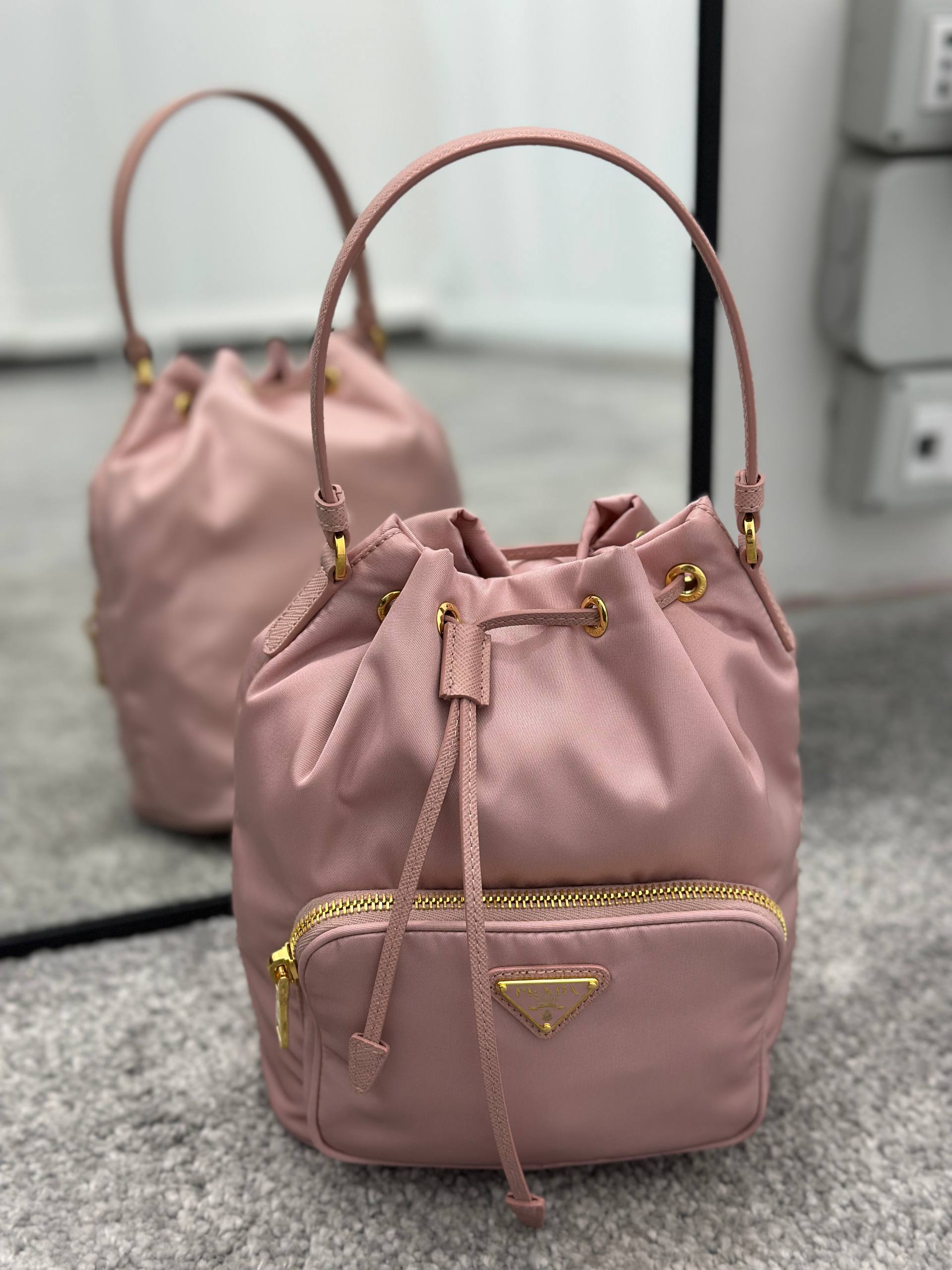 Элегантная женская сумка-мешок пыльно-розового цвета от бренда Prada. Модель выполнена из прочного нейлона и дополнена отделкой из сафьяновой кожи. На лицевой стороне расположен накладной карман на молнии, украшенный классическим треугольным эмалированным логотипом. Сумка закрывается на затягивающийся шнурок-кулиску и оснащена удобной верхней ручкой. Золотистая фурнитура подчеркивает премиальный вид изделия. Состав: 100% нейлон, детали из натуральной кожи.