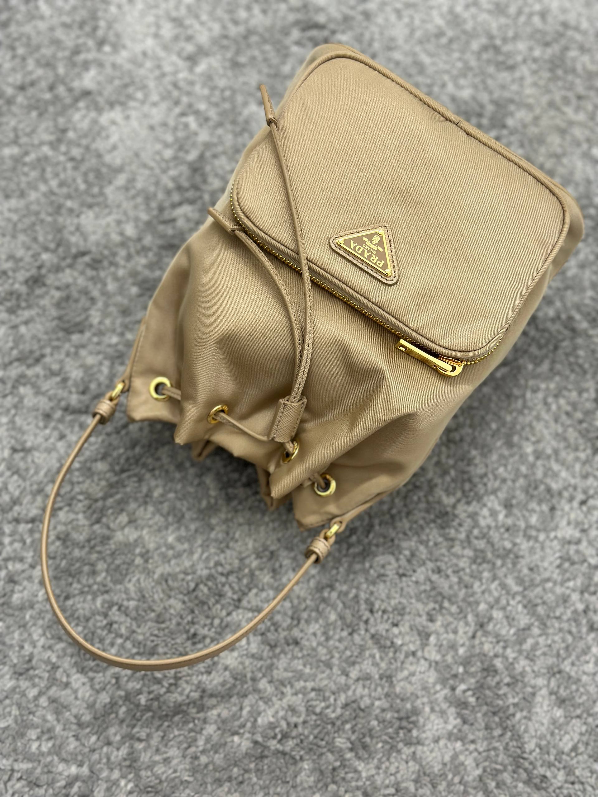 Элегантная сумка-рюкзак Prada песочно-бежевого цвета. Модель выполнена из прочного нейлона и дополнена изысканной золотистой фурнитурой. Изделие оснащено основным отделением на кулиске и накладным передним карманом на молнии, который украшен фирменным металлическим логотипом-треугольником. Состав: 100% нейлон, отделка из натуральной кожи.