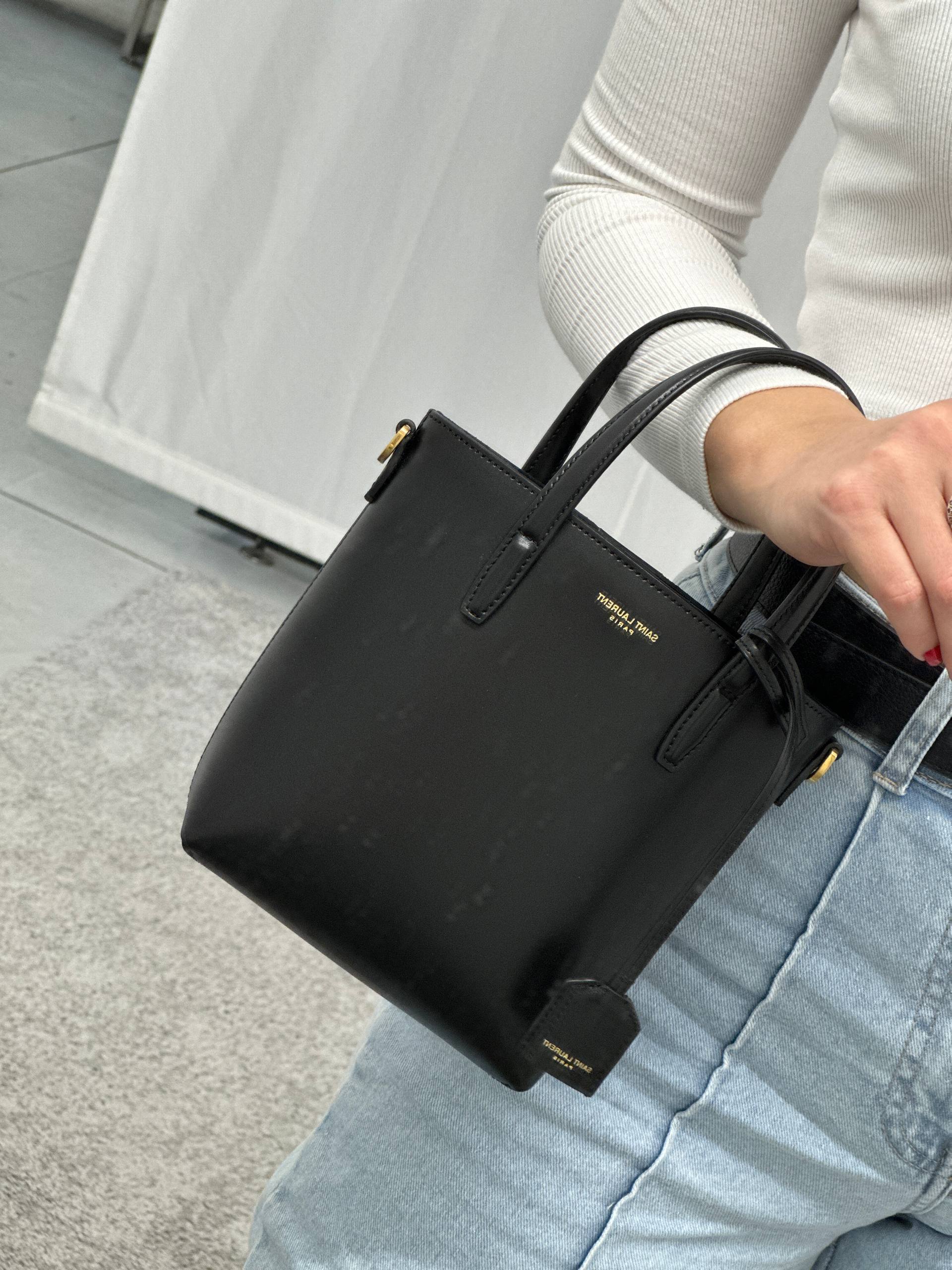 Элегантная женская сумка-тоут черного цвета из гладкой натуральной кожи. Модель дополнена лаконичным золотистым логотипом Saint Laurent Paris на передней панели и съемным кожаным брелоком. Сумка имеет две удобные ручки и оснащена фурнитурой для крепления плечевого ремня. Компактный и структурированный фасон идеально подходит для создания повседневных и деловых образов. Состав: 100% натуральная кожа.