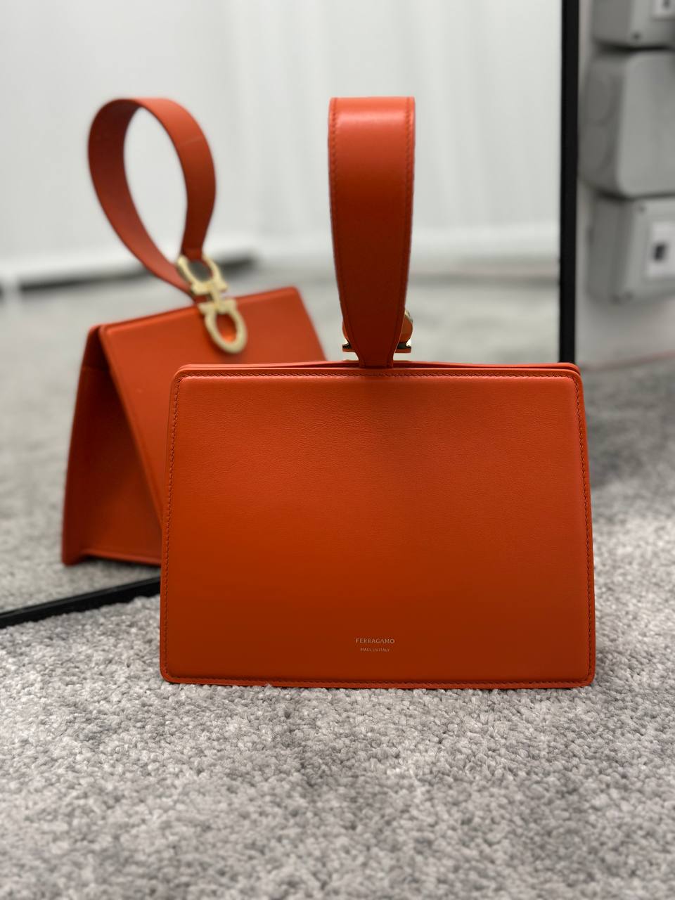 Элегантная женская сумка Ferragamo, выполненная в насыщенном оранжевом цвете. Модель прямоугольной формы отличается минималистичным дизайном и оригинальной высокой ручкой с золотистой фурнитурой в стиле Gancini. На нижней части изделия расположен лаконичный логотип бренда ‘FERRAGAMO MADE IN ITALY’. Состав: 100% натуральная кожа.