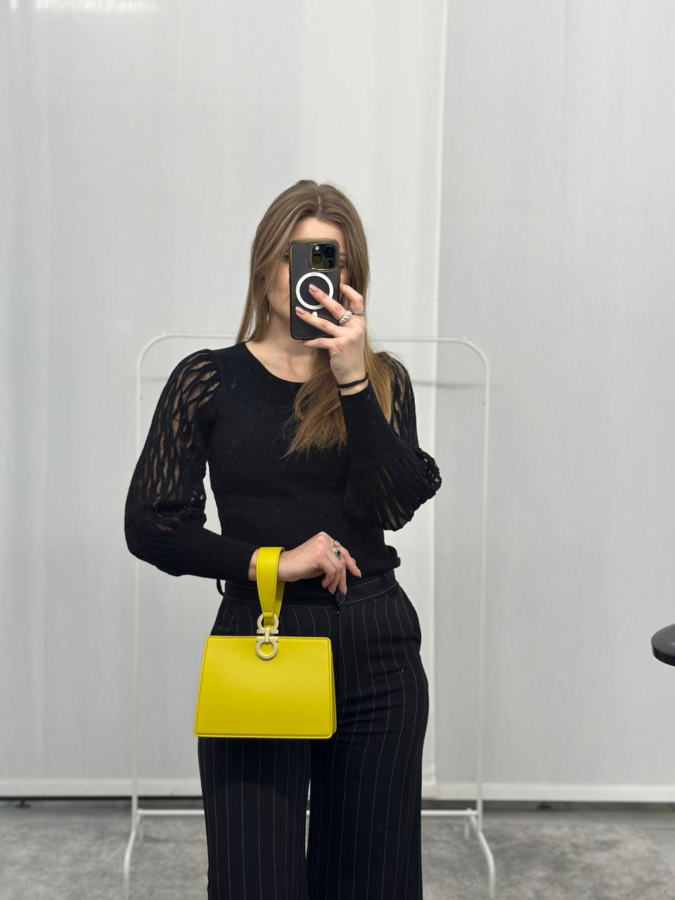 Элегантная женская сумка ярко-желтого цвета, выполненная в форме трапеции из гладкой натуральной кожи. Модель дополнена оригинальной широкой ручкой-петлей и массивной металлической застежкой в виде знакового логотипа бренда. Жесткий каркас позволяет изделию отлично сохранять форму. Этот яркий аксессуар станет стильным акцентом в любом гардеробе. Состав: 100% натуральная кожа, металлическая фурнитура.
