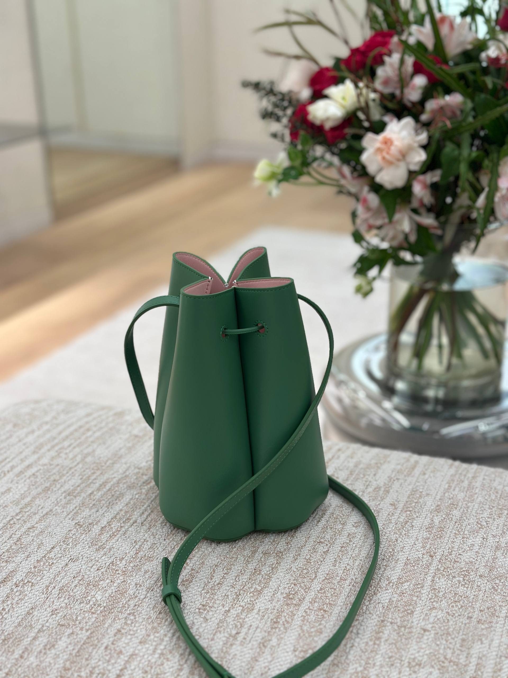 Элегантная сумка-ведро темно-зеленого цвета с уникальным складчатым дизайном, напоминающим цветок. Модель дополнена длинным тонким плечевым ремнем в тон изделия. Внутренняя часть сумки выполнена в контрастном нежно-розовом цвете. Минималистичный стиль без видимых логотипов. Состав: 100% натуральная кожа.