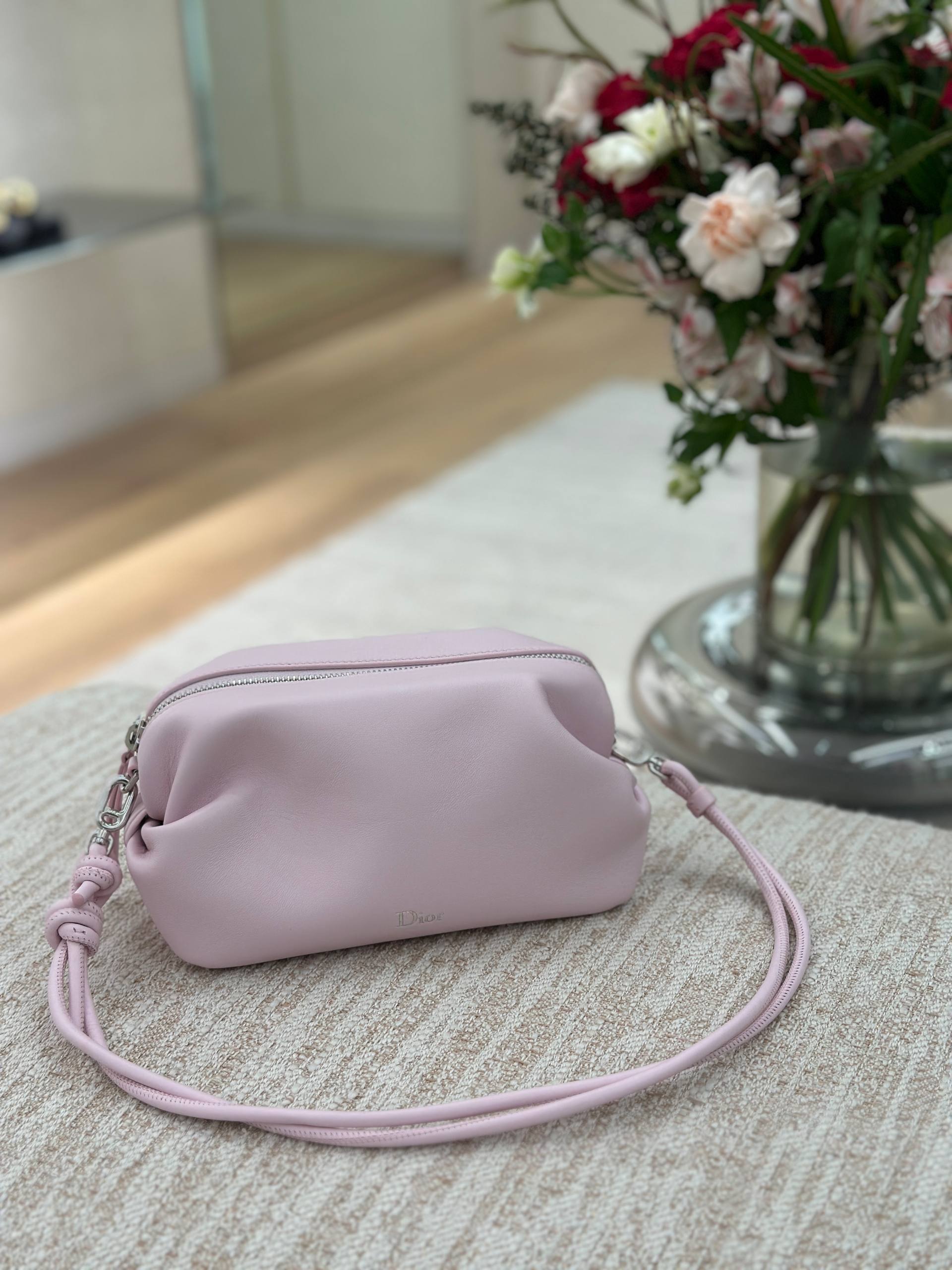 Элегантная женская сумка Dior нежно-розового цвета. Модель выполнена в мягком фасоне из высококачественной натуральной кожи с гладкой фактурой. Сумка имеет одно основное отделение на молнии и дополнена изящным тонким плечевым ремнем в тон изделия. На передней части внизу расположен лаконичный металлический логотип Dior. Состав: 100% натуральная кожа теленка, металлическая фурнитура.