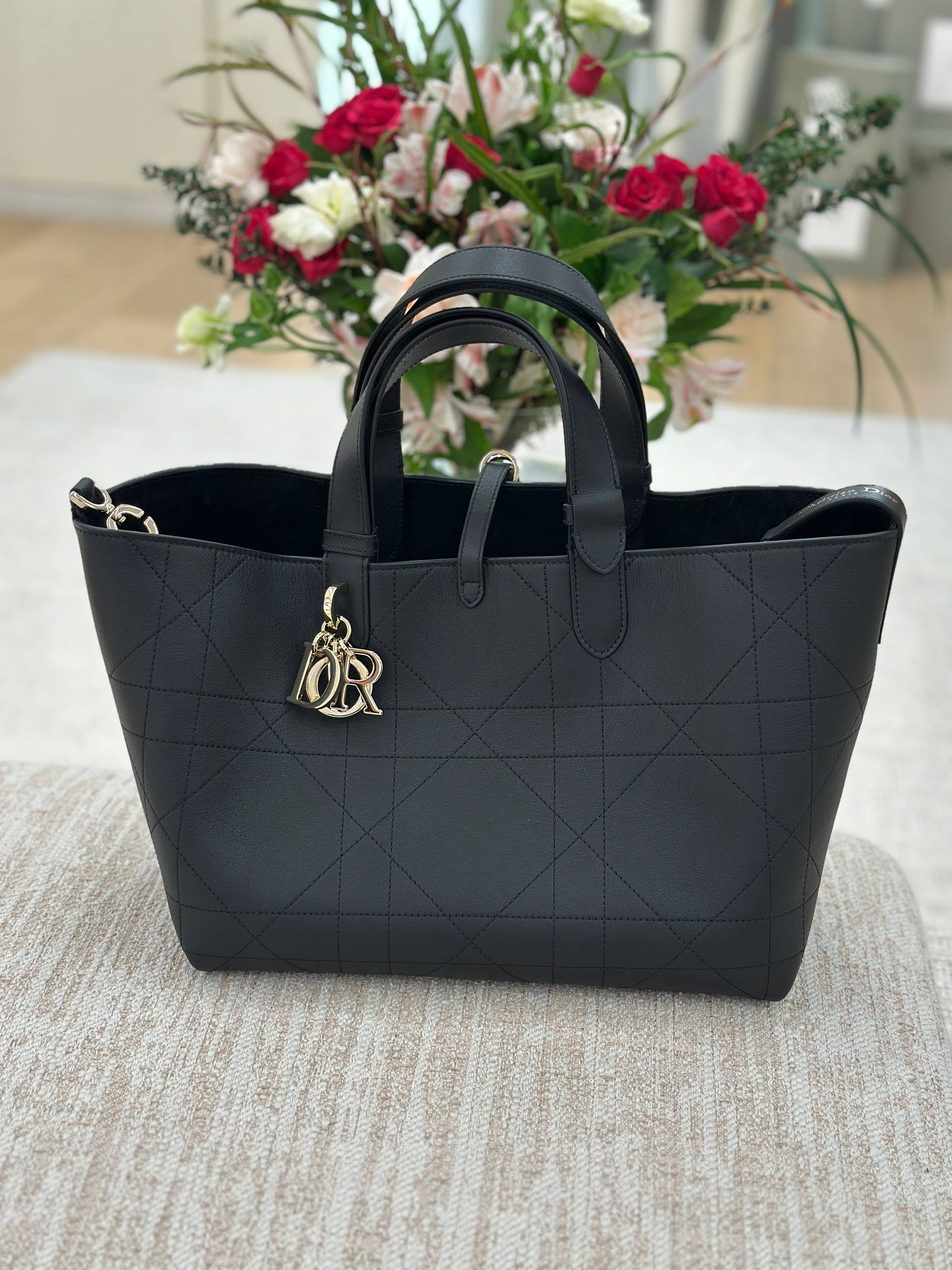 Стильная женская сумка-тоут черного цвета, выполненная из натуральной кожи с характерным стеганым узором Macrocannage. Модель дополнена двумя парами кожаных ручек разной длины и украшена съемными золотистыми шармами в виде букв логотипа D.I.O.R. Вместительное основное отделение закрывается на кожаный ремешок. Состав: 100% натуральная кожа.