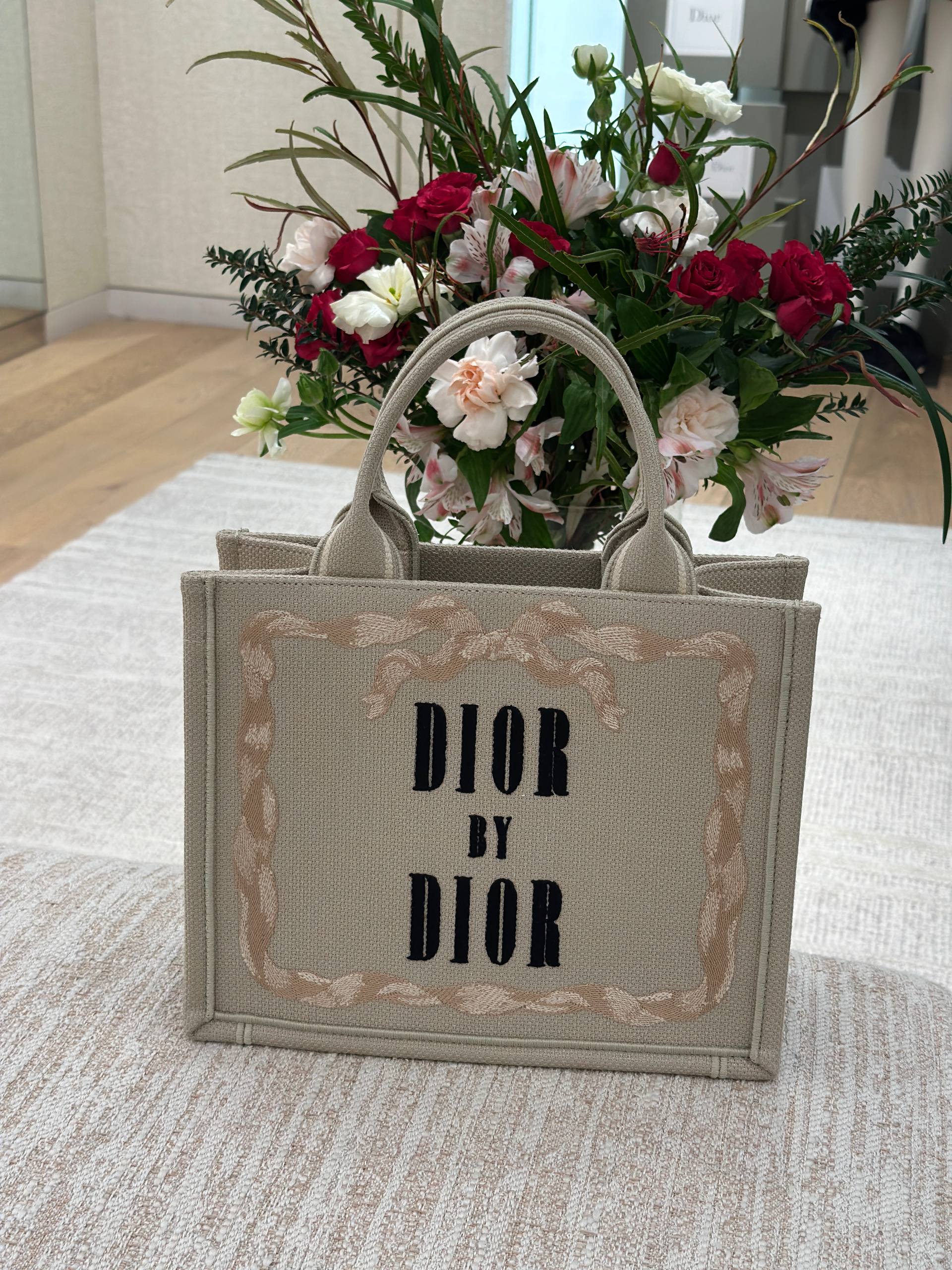 Элегантная женская сумка-тоут Dior бежевого цвета, выполненная из плотного фактурного текстиля. Лицевая сторона декорирована контрастным черным принтом ‘DIOR BY DIOR’ и обрамлена изящной вышивкой в виде плетеного орнамента. Модель имеет жесткую прямоугольную форму и две короткие ручки для ношения в руках. Состав: 100% текстиль.