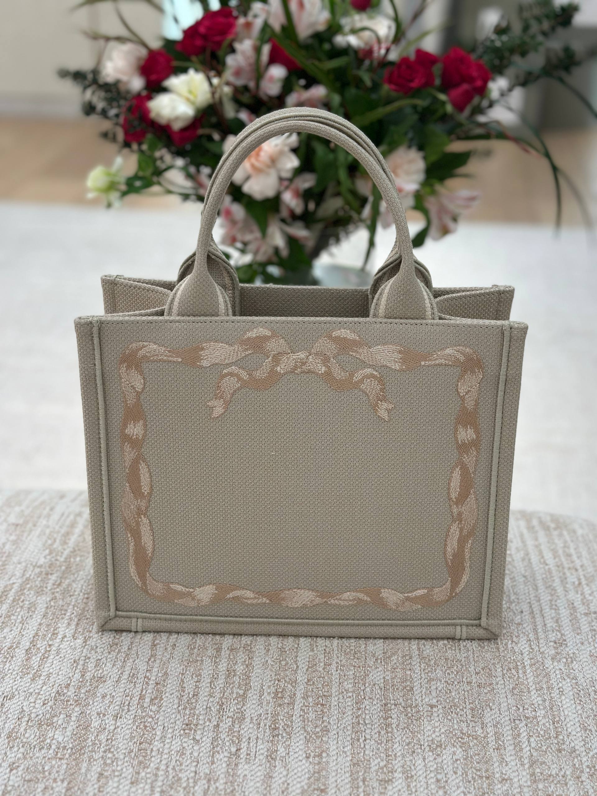 Элегантная женская сумка-тоут прямоугольной формы, выполненная в лаконичном бежевом цвете. Лицевая сторона декорирована изысканной вышивкой в виде переплетенных лент и банта. Модель оснащена двумя прочными верхними ручками для ношения в руках. Лаконичный дизайн и нейтральный оттенок делают её универсальным аксессуаром для повседневных образов. Состав: 100% хлопок, плотный холщовый текстиль.