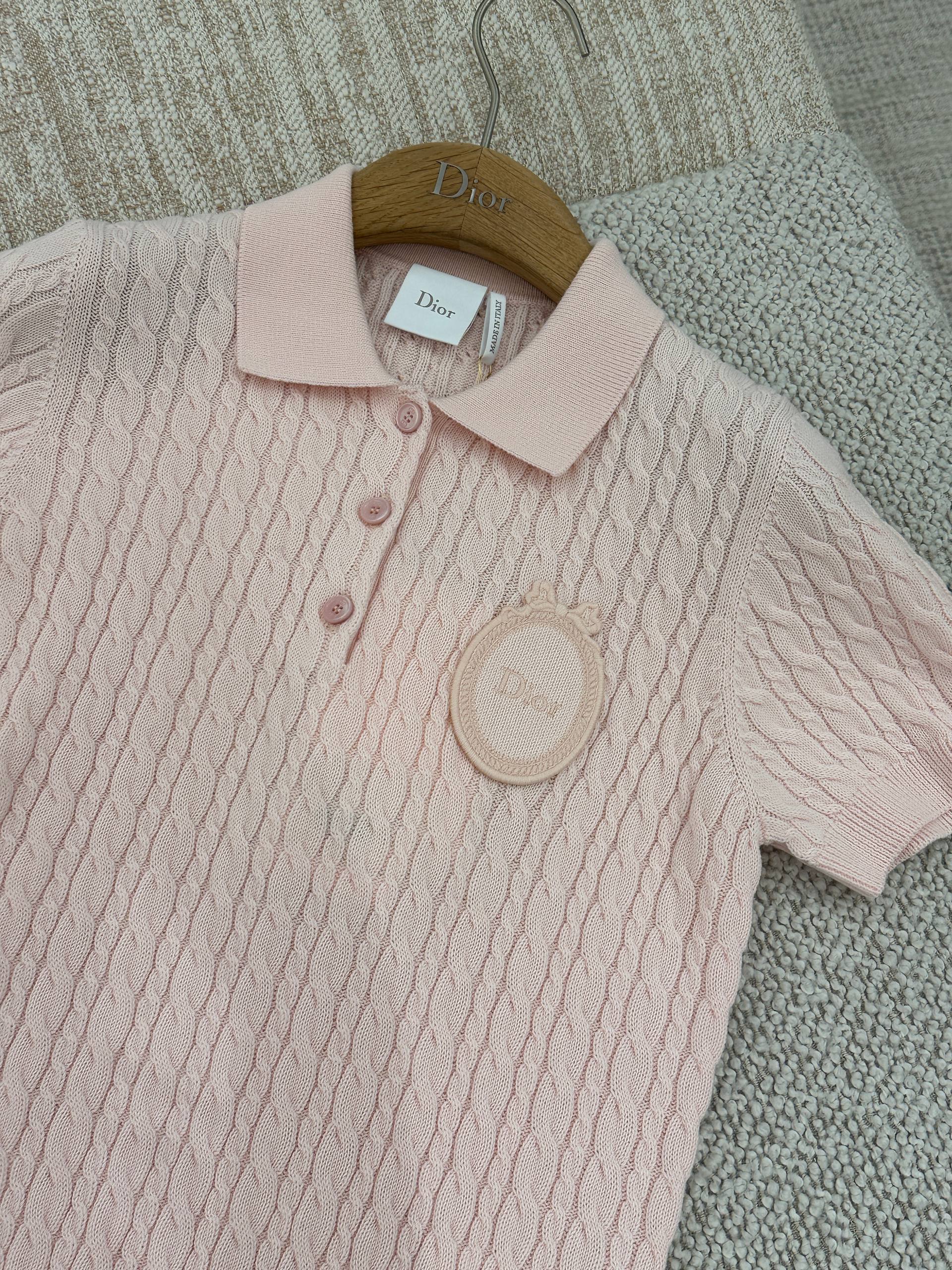 Элегантная вязаная футболка-поло Christian Dior нежно-розового цвета. Модель выполнена изящным рельефным узором «косы» (cable knit). Изделие имеет короткие рукава, классический отложной воротник и застежку на три пуговицы в тон изделия. На груди расположена декоративная овальная нашивка с логотипом Dior. Состав: 100% хлопок.