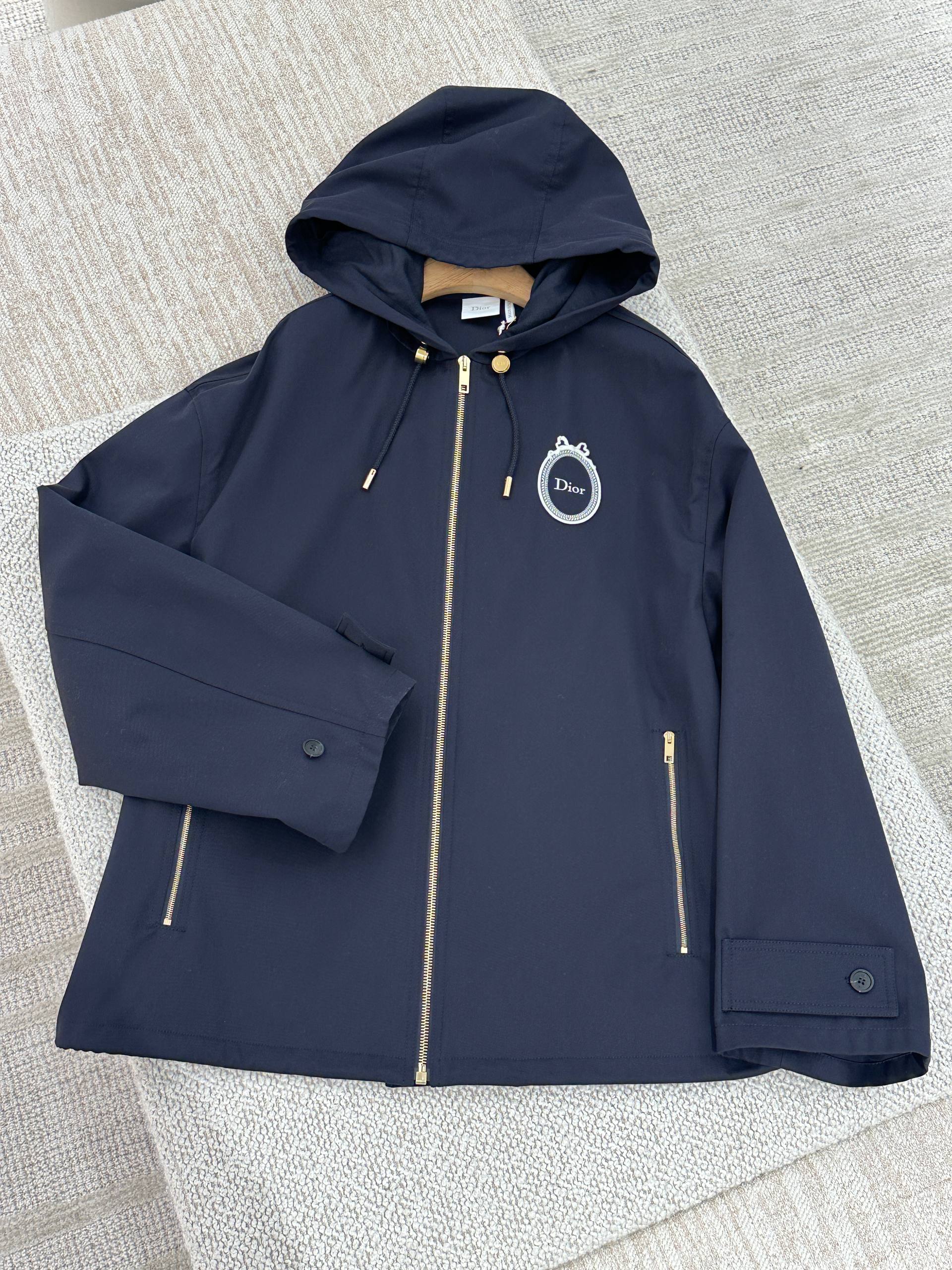 Элегантная женская ветровка темно-синего цвета от Dior. Модель прямого кроя дополнена капюшоном на регулируемых завязках с золотистой фурнитурой. Куртка застегивается на центральную металлическую молнию золотого цвета. На груди расположен контрастный белый патч с логотипом бренда. Изделие оснащено двумя боковыми карманами на молнии и манжетами на пуговицах. Состав: 100% полиэстер.
