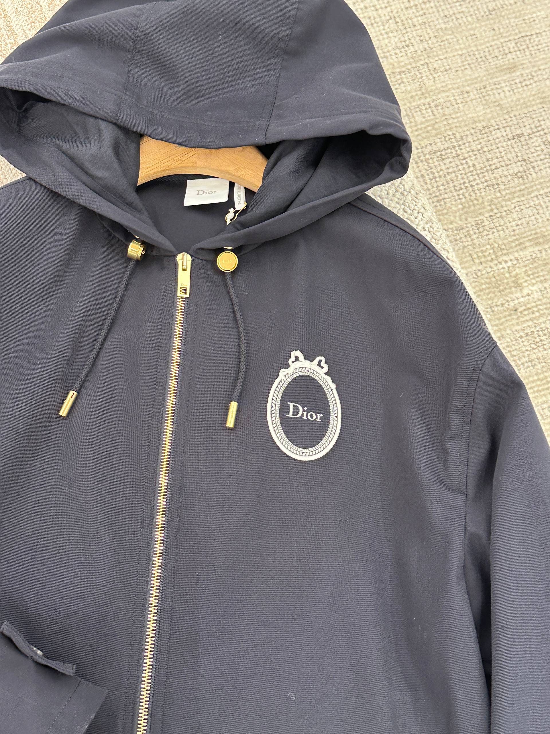 Черная куртка Dior с капюшоном на кулиске. Модель свободного кроя дополнена застежкой на золотистую молнию и фурнитурой с гравировкой CD. На груди расположена контрастная белая вышивка с логотипом Dior в классической овальной рамке. Длинные рукава дополнены манжетами на пуговицах. Состав: 100% хлопок.