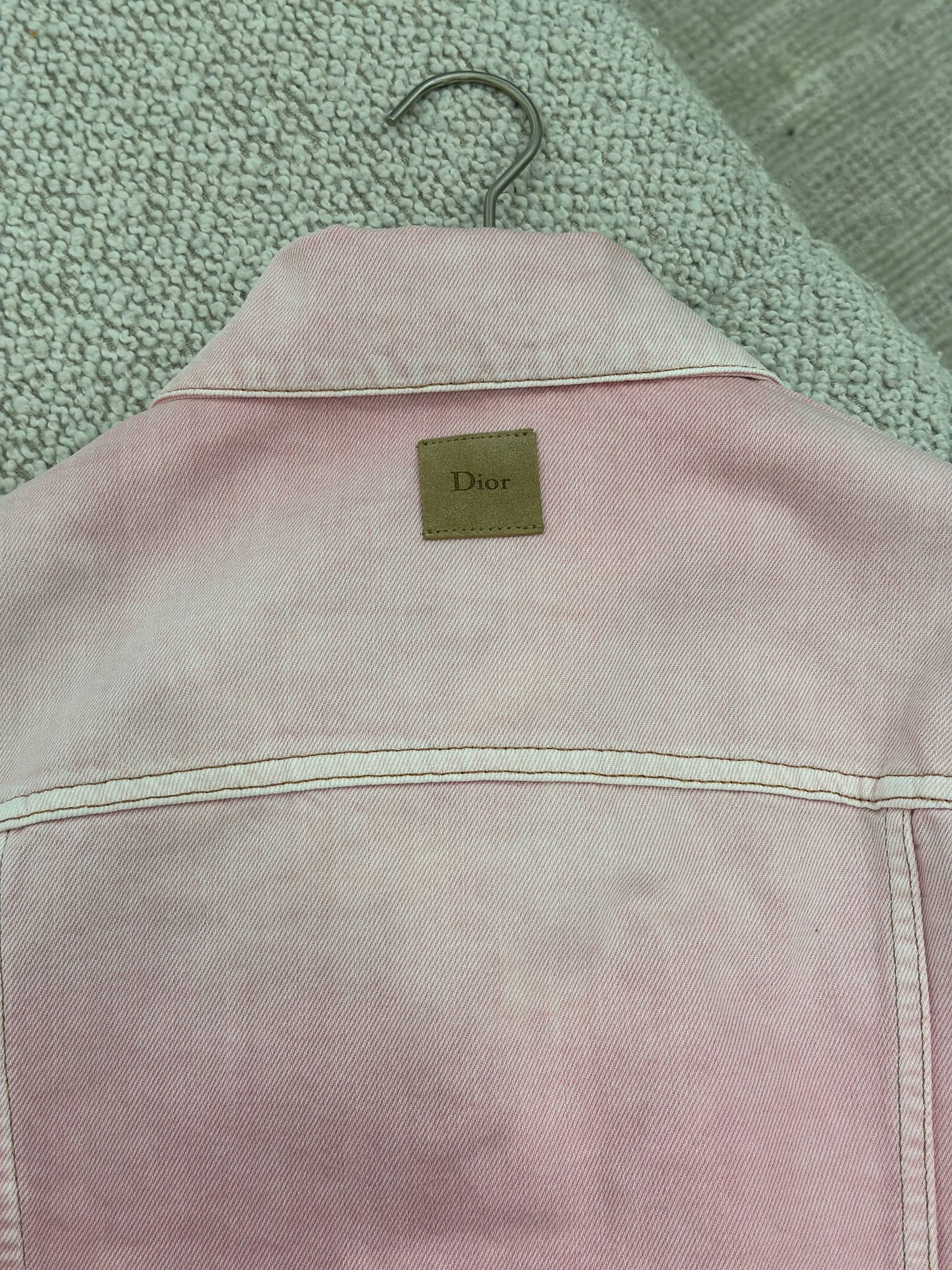Элегантная джинсовая куртка нежно-розового цвета от модного дома Dior. Модель классического фасона с отложным воротником, выполненная из качественного денима с легким эффектом выбеливания. На спинке под воротником расположена фирменная кожаная нашивка коричневого цвета с тисненым логотипом Dior. Состав: 100% хлопок.