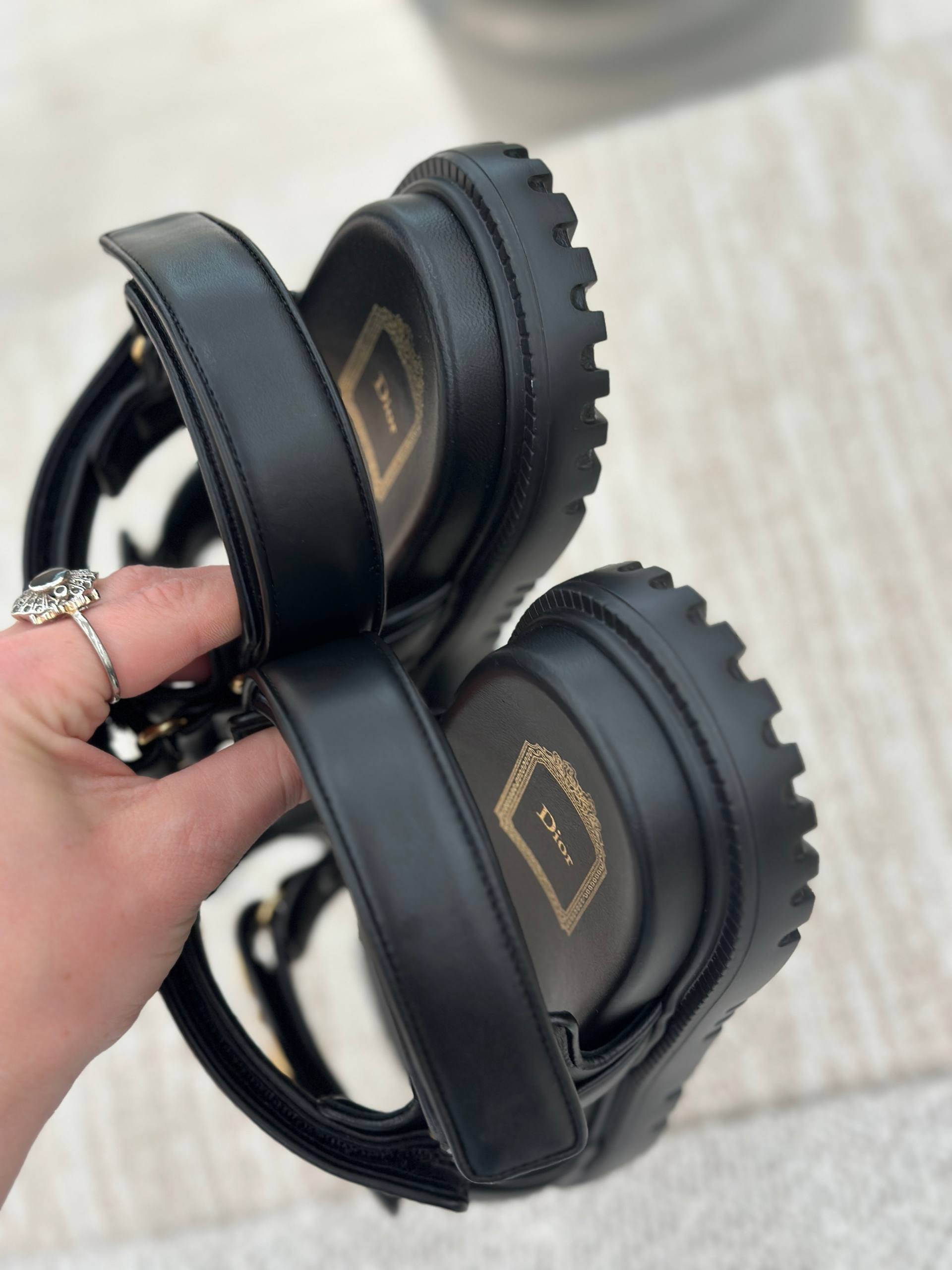 Стильные женские сандалии Dior в черном цвете. Модель отличается массивной тракторной подошвой и широкими регулируемыми ремешками. На стельке расположен узнаваемый золотистый логотип бренда. Обувь выполнена в современном стиле, сочетающем комфорт и высокую моду. Состав: 100% натуральная кожа, подошва из прочной резины.