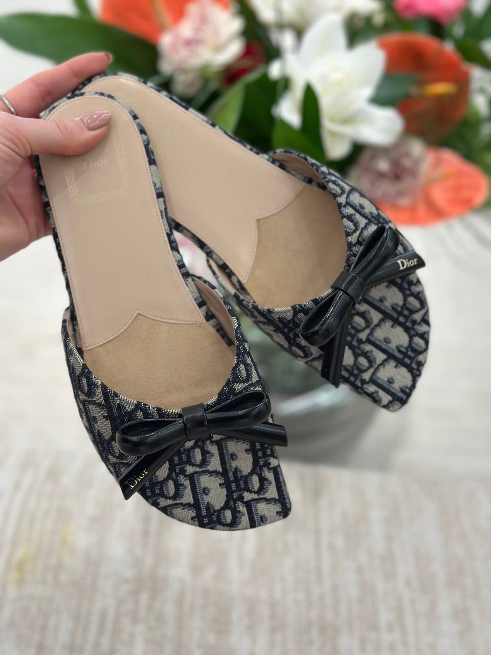 Элегантные женские мюли выполнены из плотного текстиля с узнаваемым жаккардовым узором Dior Oblique в сине-бежевых тонах. Модель отличается открытой пяткой и слегка закругленным квадратным мысом. Носочную часть украшает декоративный бант из черной кожи с лаконичной надписью Dior. Стелька выполнена из натуральной кожи бежевого цвета с тиснением логотипа бренда. Состав: верх — текстиль (канва), внутренняя отделка и стелька — натуральная кожа.