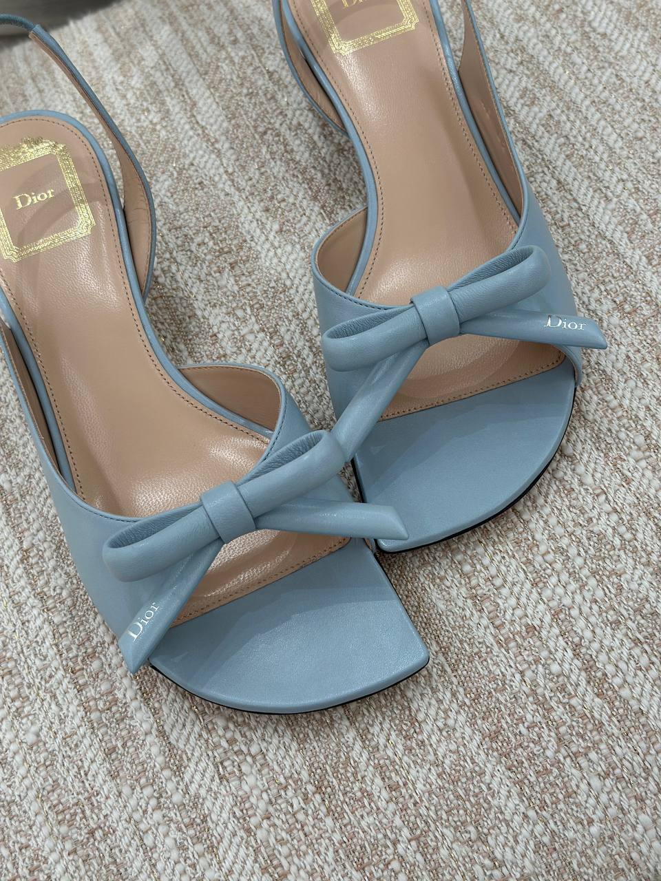 Элегантные женские босоножки Dior нежно-голубого цвета. Модель выполнена в фасоне слингбэков с открытой пяткой и современным квадратным мысом. Изделие декорировано изящным кожаным бантом с аккуратным логотипом бренда на кончике. Стелька дополнена золотистым тиснением с логотипом Dior. Состав: 100% натуральная кожа.