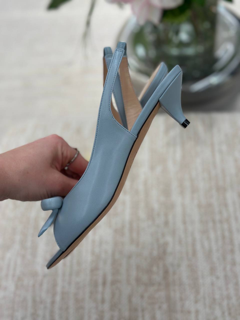 Элегантные женские слингбэки нежно-голубого цвета. Модель выполнена из мягкой натуральной кожи с заостренным мысом, декорированным объемным узлом. Открытая пятка фиксируется тонким ремешком с эластичной вставкой. Устойчивый каблук-рюмочка (kitten heel) обеспечивает комфорт в течение всего дня. Состав: 100% натуральная кожа.