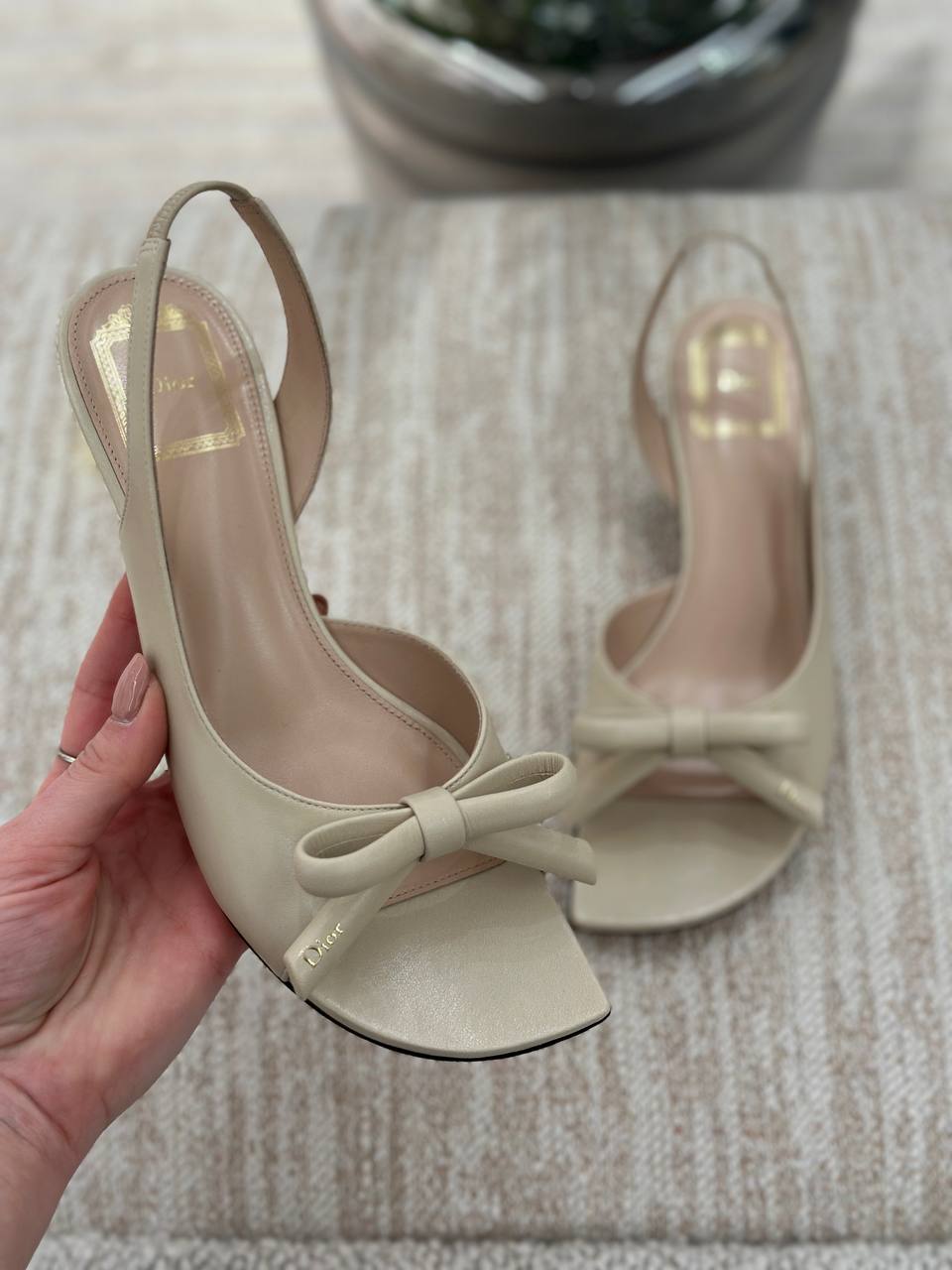 Элегантные женские босоножки Dior в бежевом цвете. Модель с открытой пяткой (slingback) и актуальным квадратным мысом. Изделие декорировано изящным кожаным бантом с металлическим логотипом Dior золотистого цвета. Состав: 100% натуральная кожа снаружи и внутри, кожаная подошва.