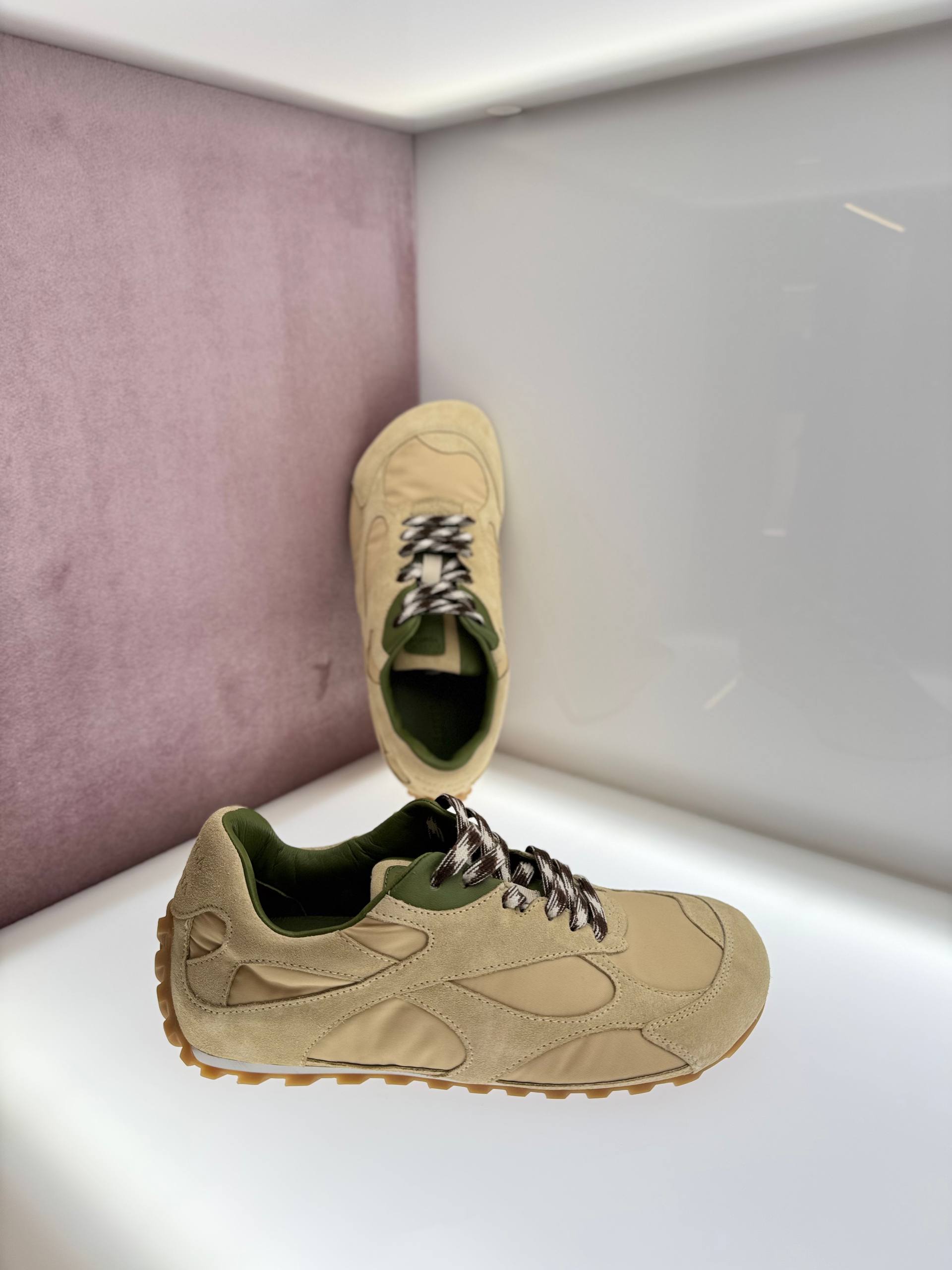 Элегантные женские кроссовки в бежевом цвете с контрастными оливковыми деталями. Модель в стиле ретро-раннеров выполнена из комбинации высококачественной натуральной замши и текстильных вставок. Характерной чертой является медовая каучуковая подошва с шипованным протектором, заходящим на мысок и пятку. Обувь дополнена двухцветными шнурками с узором, кожаной подкладкой и тисненым логотипом на язычке и заднике. Состав: 100% натуральная замша, 100% текстиль, подкладка — 100% кожа, по