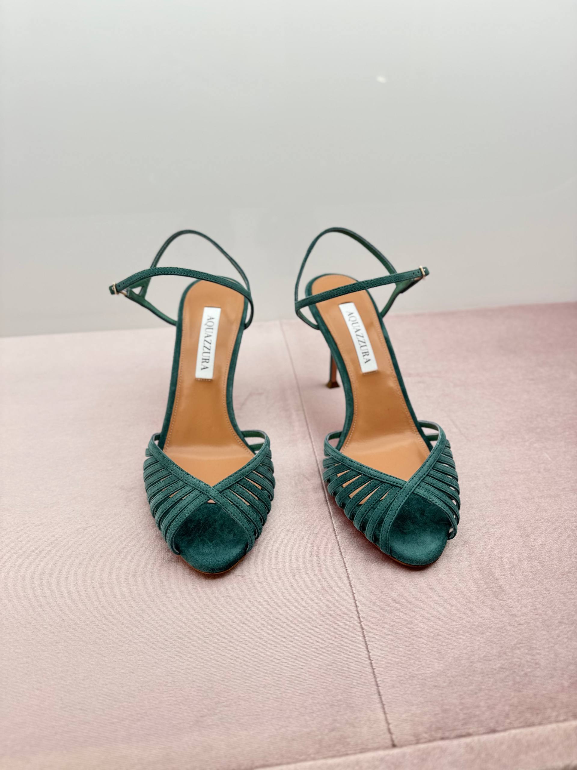 Элегантные женские босоножки Aquazzura насыщенного изумрудного цвета. Модель выполнена из мягкой натуральной замши с изысканным дизайном в виде множества тонких переплетенных ремешков в передней части. Открытый мысок и тонкий регулируемый ремешок на щиколотке подчеркивают утонченность силуэта. Высокий каблук-шпилька придает образу женственности. На внутренней стельке расположен фирменный логотип бренда. Состав: 100% натуральная замша, подошва и стелька — 100% натуральная кожа.