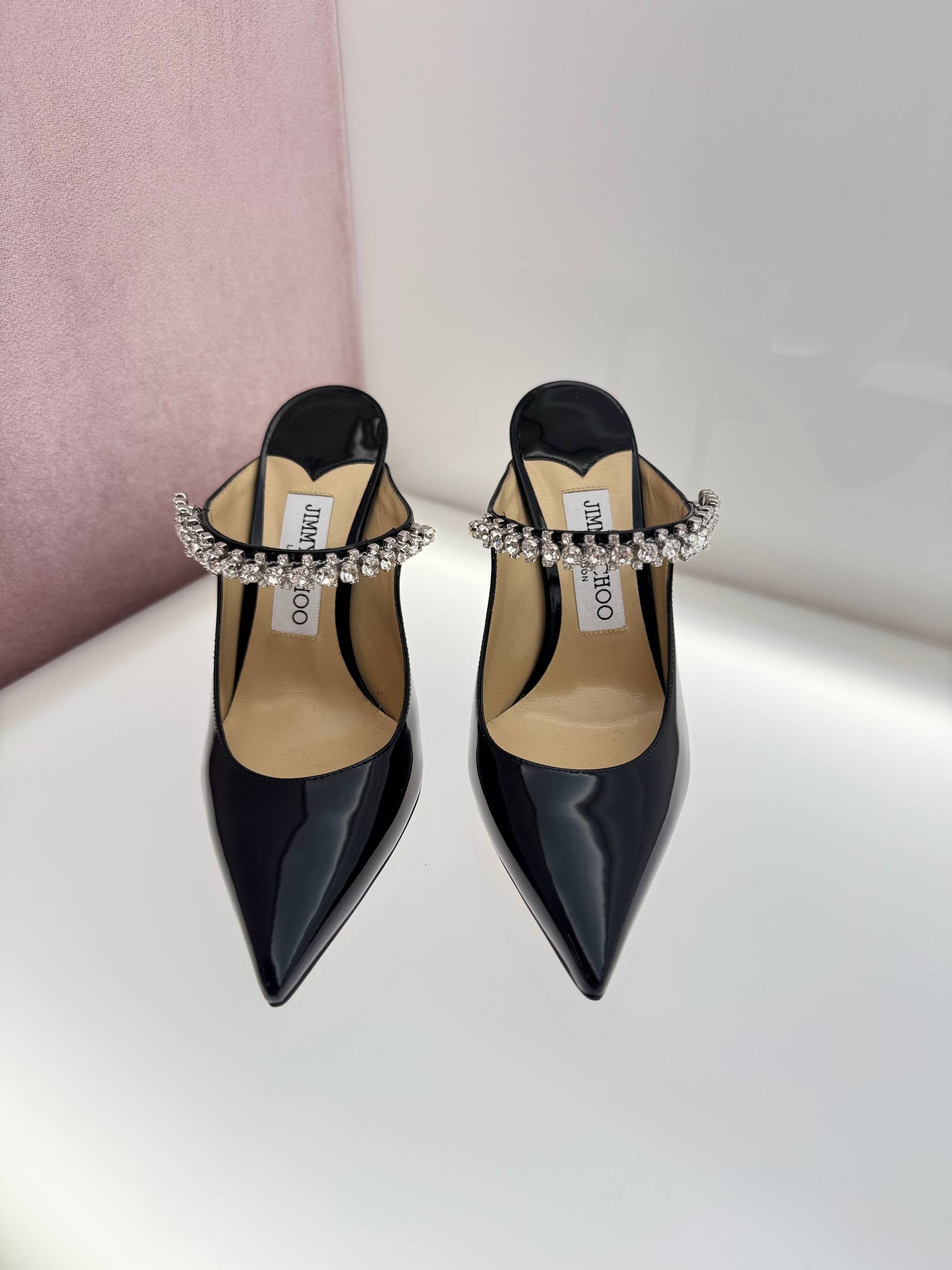 Элегантные женские мюли Jimmy Choo черного цвета, выполненные из глянцевой лаковой кожи. Модель отличается острым мысом и декорированным ремешком на подъеме, украшенным сверкающими кристаллами. Внутренняя часть и стелька дополнены нашивкой с логотипом бренда Jimmy Choo London. Высокий тонкий каблук придает паре утонченность. Состав: верх — 100% лакированная кожа, подкладка и стелька — 100% натуральная кожа, подошва — 100% кожа.