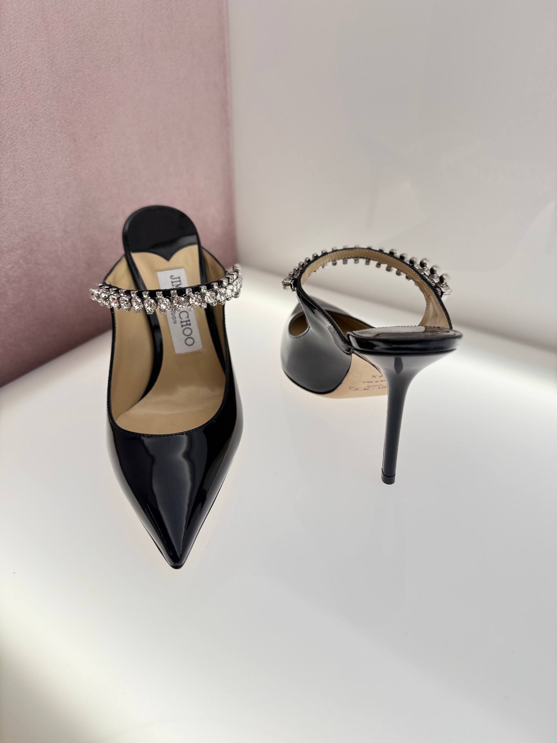 Элегантные черные мюли от Jimmy Choo, выполненные из глянцевой лакированной кожи. Модель отличается заостренным мысом и эффектным ремешком на подъеме, украшенным сверкающими кристаллами в серебристой оправе. Высокий тонкий каблук-шпилька подчеркивает изящество силуэта. На стельке расположен логотип Jimmy Choo. Состав: верх — 100% лакированная кожа, внутренняя отделка и подошва — 100% натуральная кожа.