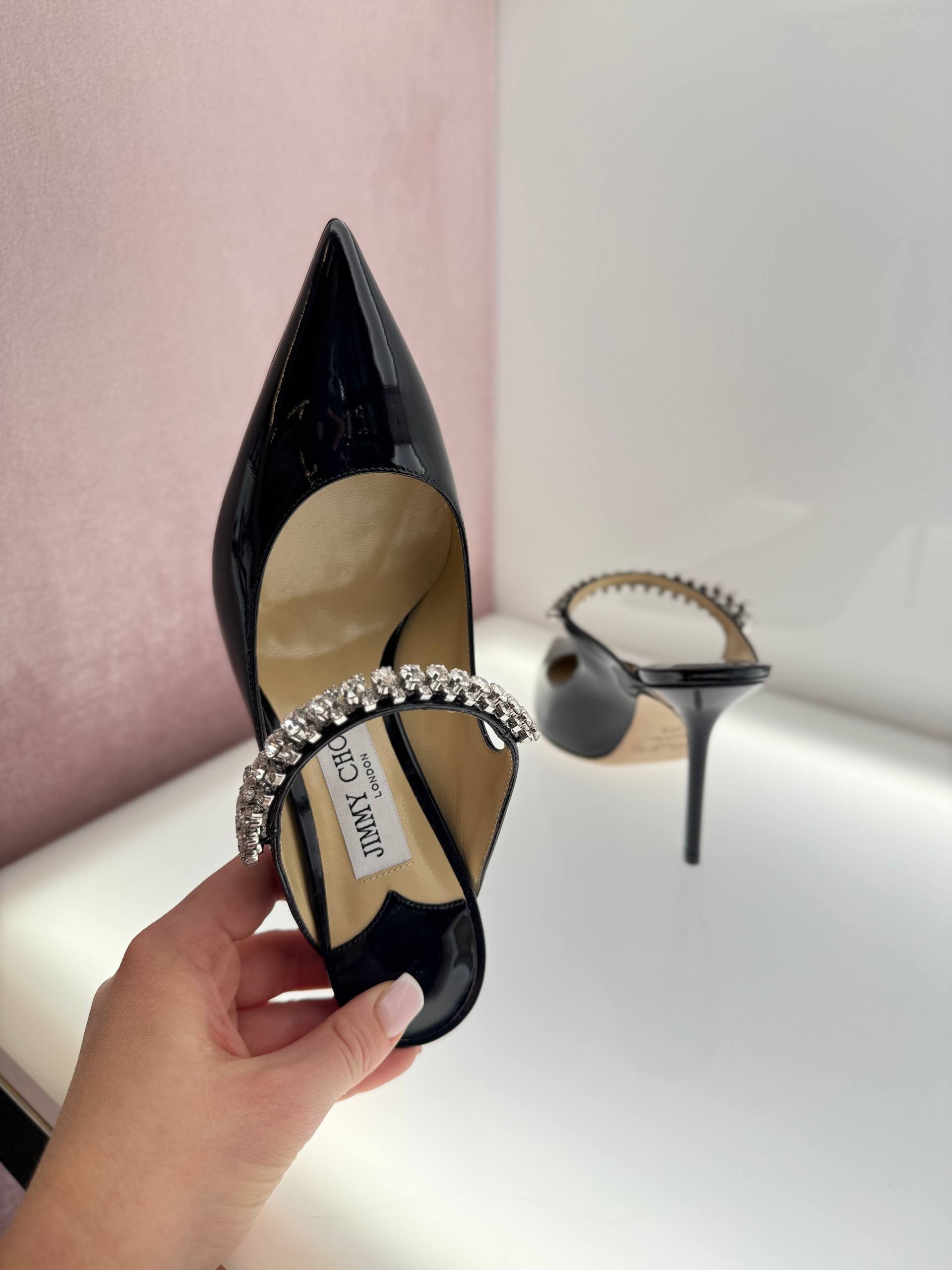 Элегантные женские мюли Jimmy Choo черного цвета, выполненные из блестящей лакированной кожи. Модель с острым мысом и открытой пяткой на высокой шпильке. Главным акцентом служит изящный ремешок, декорированный крупными сверкающими кристаллами. На стельке расположен фирменный логотип Jimmy Choo London. Состав: 100% лакированная кожа, стелька и подошва — 100% натуральная кожа, декор — кристаллы.