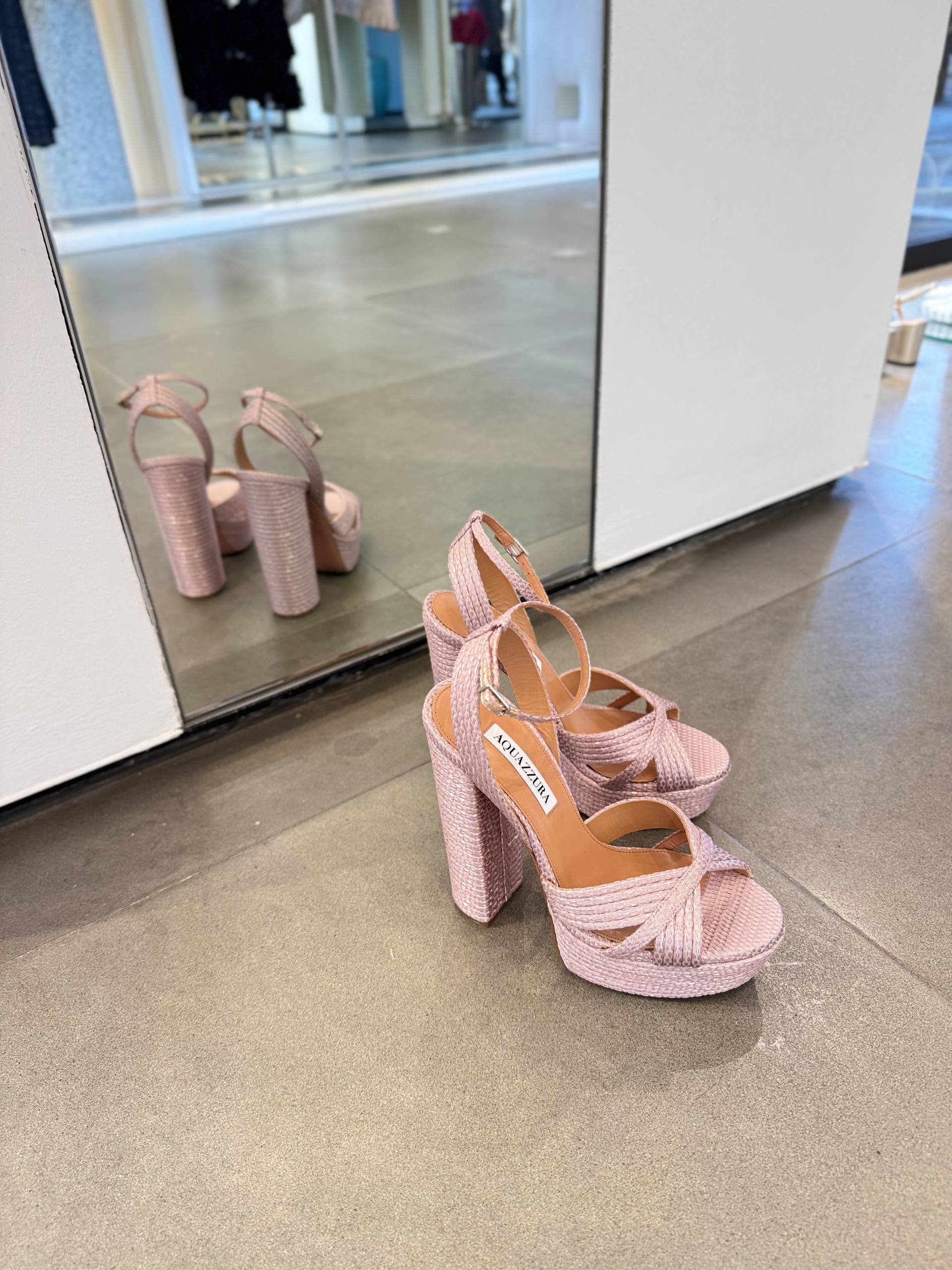 Элегантные босоножки Aquazzura нежно-розового цвета на высокой платформе и массивном устойчивом каблуке. Модель выполнена из фактурного текстиля с деликатным блеском и переплетением ремешков в передней части. Тонкий ремешок вокруг щиколотки с миниатюрной металлической пряжкой обеспечивает комфортную фиксацию стопы. На стельке расположен логотип бренда. Состав: верх — текстиль с люрексом, подкладка и стелька — 100% кожа, подошва — кожа.
