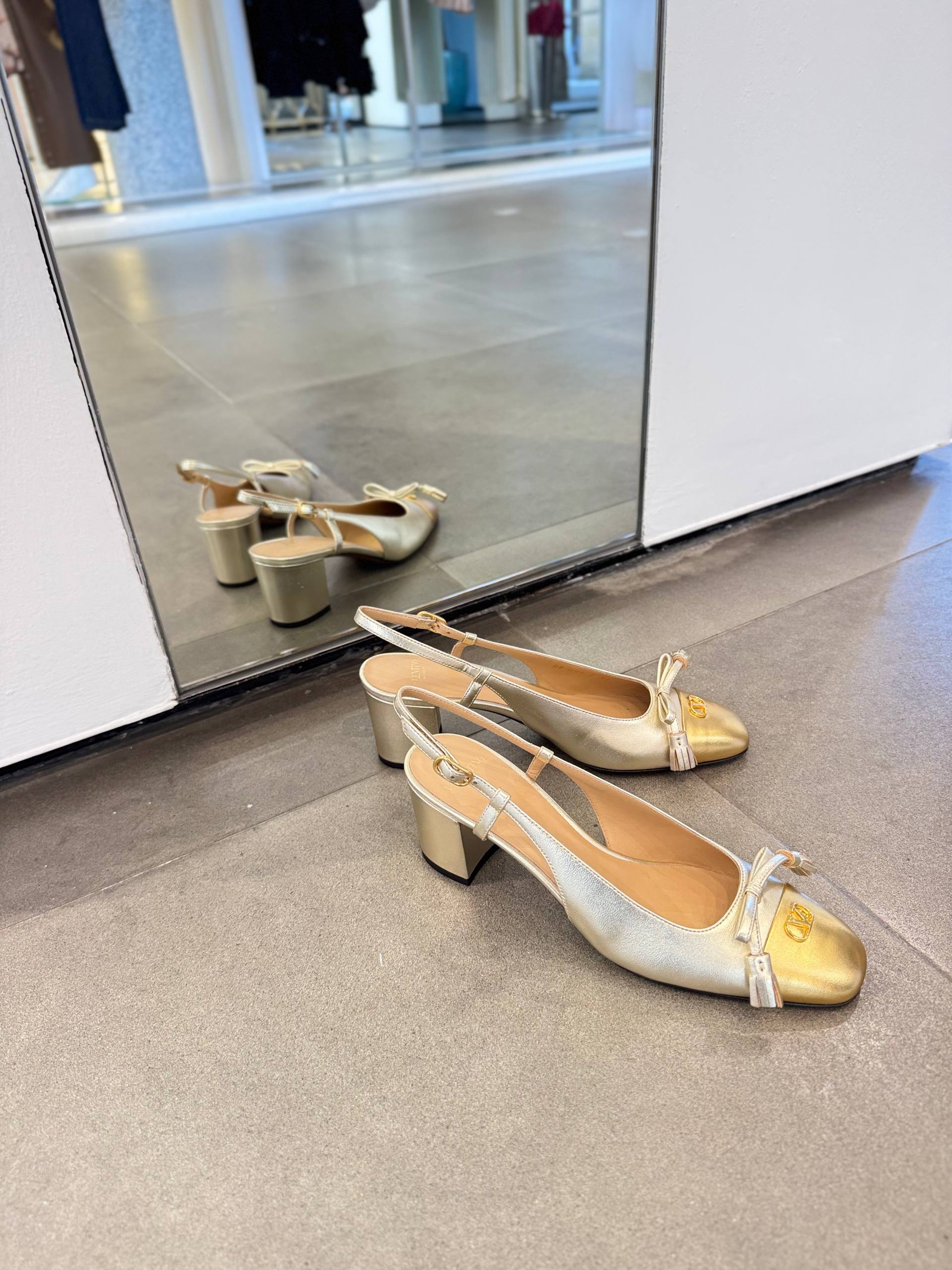 Элегантные женские туфли-слингбэки выполнены в изысканном золотистом цвете с эффектом металлик. Модель с открытой пяткой на устойчивом блочном каблуке средней высоты. Декорированы бантом с миниатюрными кисточками и фирменным золотистым логотипом VLogo на мыске. Контрастный носок добавляет паре оригинальности. Эти туфли станут идеальным дополнением к вечернему или праздничному гардеробу. Состав: 100% натуральная кожа.