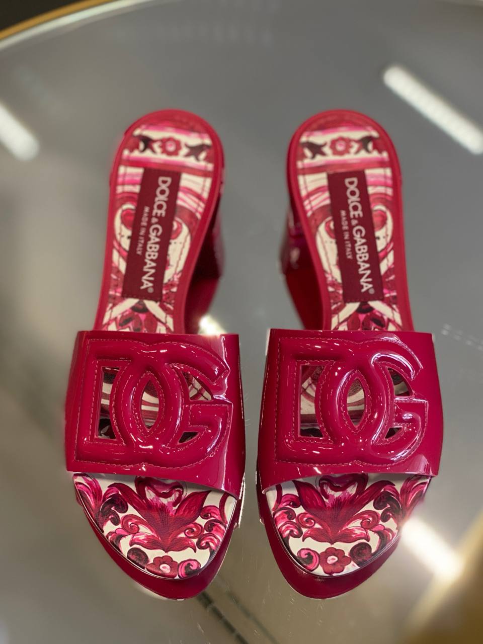 Ярко-розовые женские шлепанцы Dolce & Gabbana из лакированного материала. Модель декорирована крупным прорезным логотипом DG на широком ремешке. Стелька оформлена фирменным орнаментальным принтом и брендированной нашивкой.