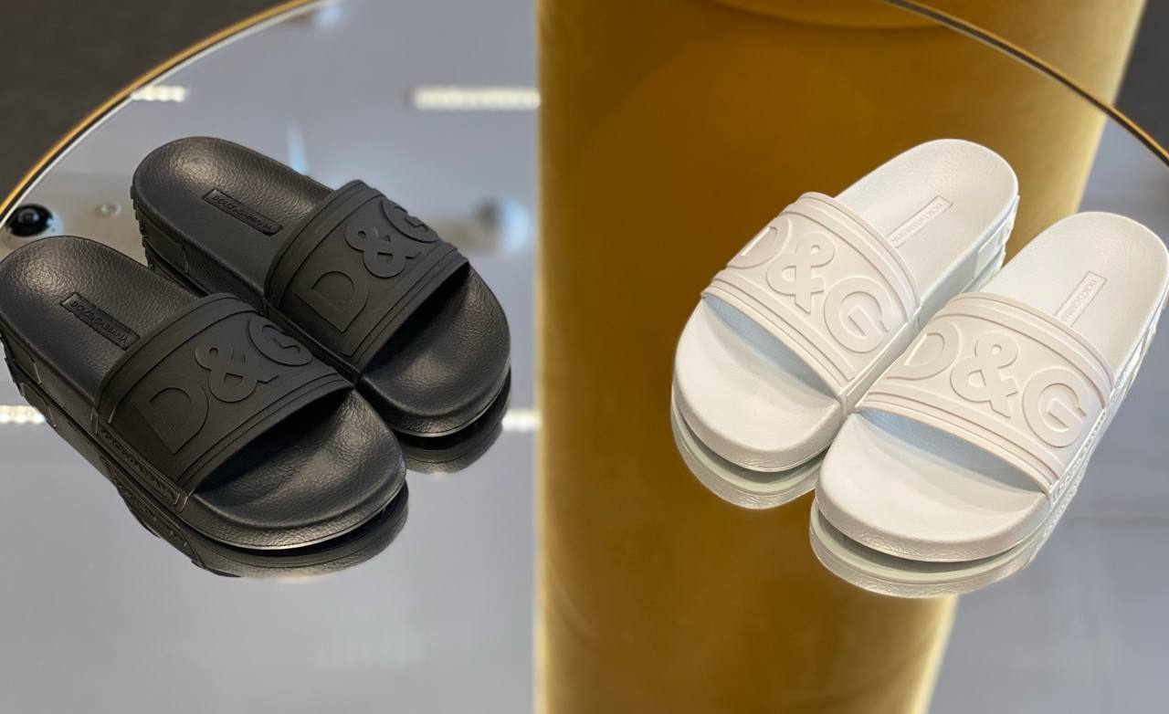 Стильные резиновые шлепанцы (слайды) от Dolce & Gabbana. Модель с широким ремешком, декорированным крупным объемным логотипом D&G. Обувь представлена в двух классических цветах: черном и белом. Анатомическая стелька дополнена фирменной нашивкой с названием бренда.