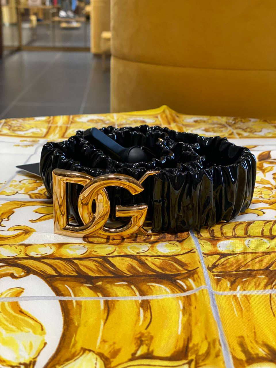 Элегантный женский ремень черного цвета с эффектной жатой фактурой. Аксессуар выполнен в стиле «скранч» с объемными складками. Главным акцентом служит массивная металлическая пряжка золотистого цвета в форме узнаваемого логотипа DG.