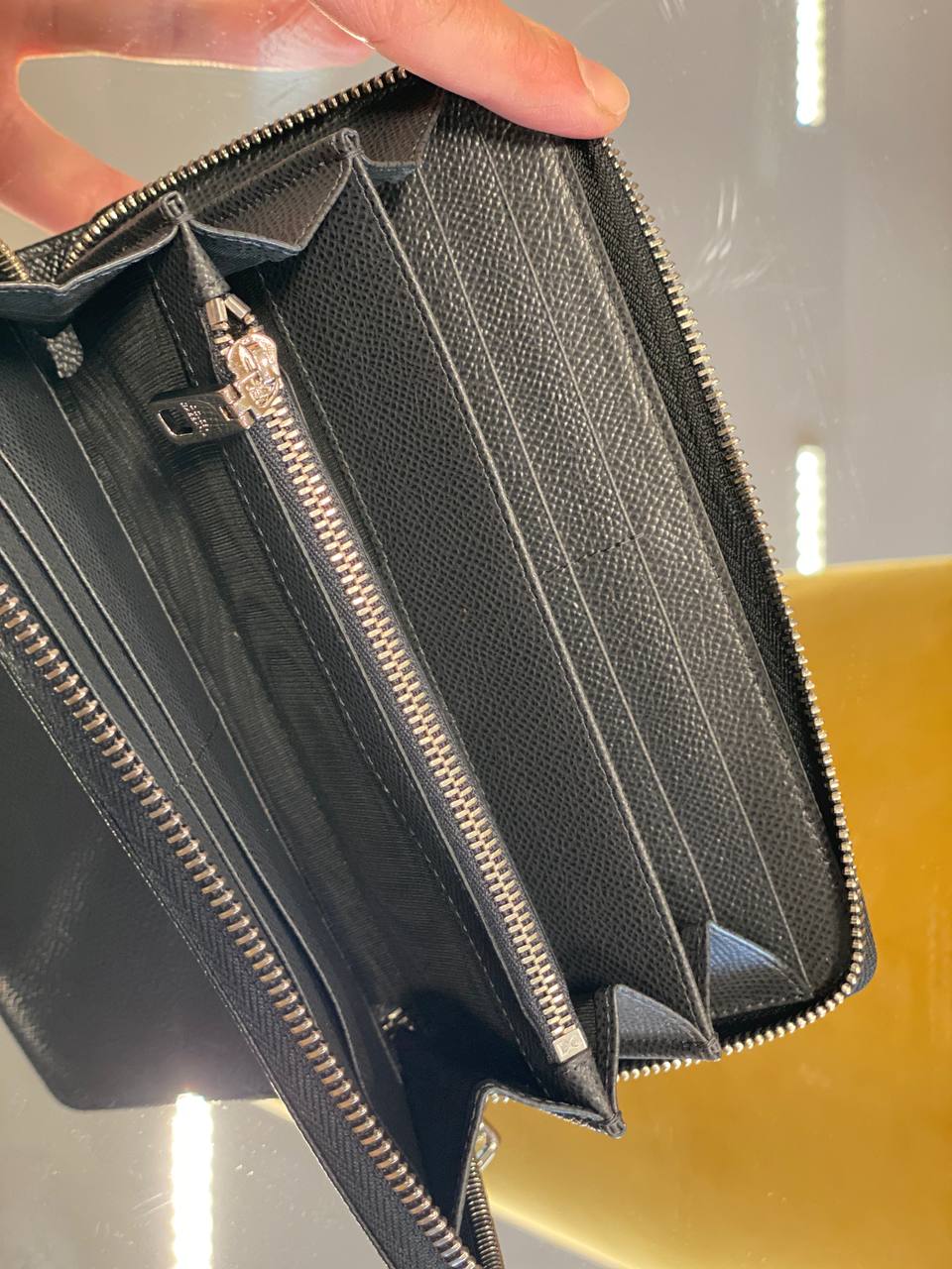 Черный кошелек из фактурной зернистой кожи. Внутренняя организация включает в себя множество слотов для пластиковых карт, отделения для купюр и центральный карман на молнии для монет. Модель дополнена серебристой металлической фурнитурой. На пуллере внутренней молнии виден логотип Saint Laurent Paris.