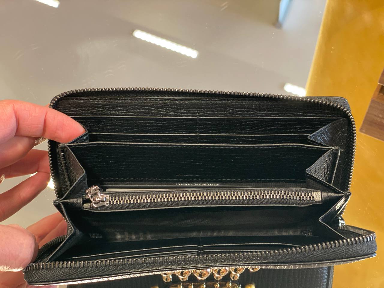 Черный кошелек Dolce & Gabbana из фактурной кожи на круговой молнии. Внутренняя организация включает несколько отделений для купюр, множество слотов для карт и центральный карман для монет на серебристой молнии. Изделие дополнено золотистыми декоративными элементами на внешней стороне. На бегунке молнии и внутренней карточке виден логотип бренда.