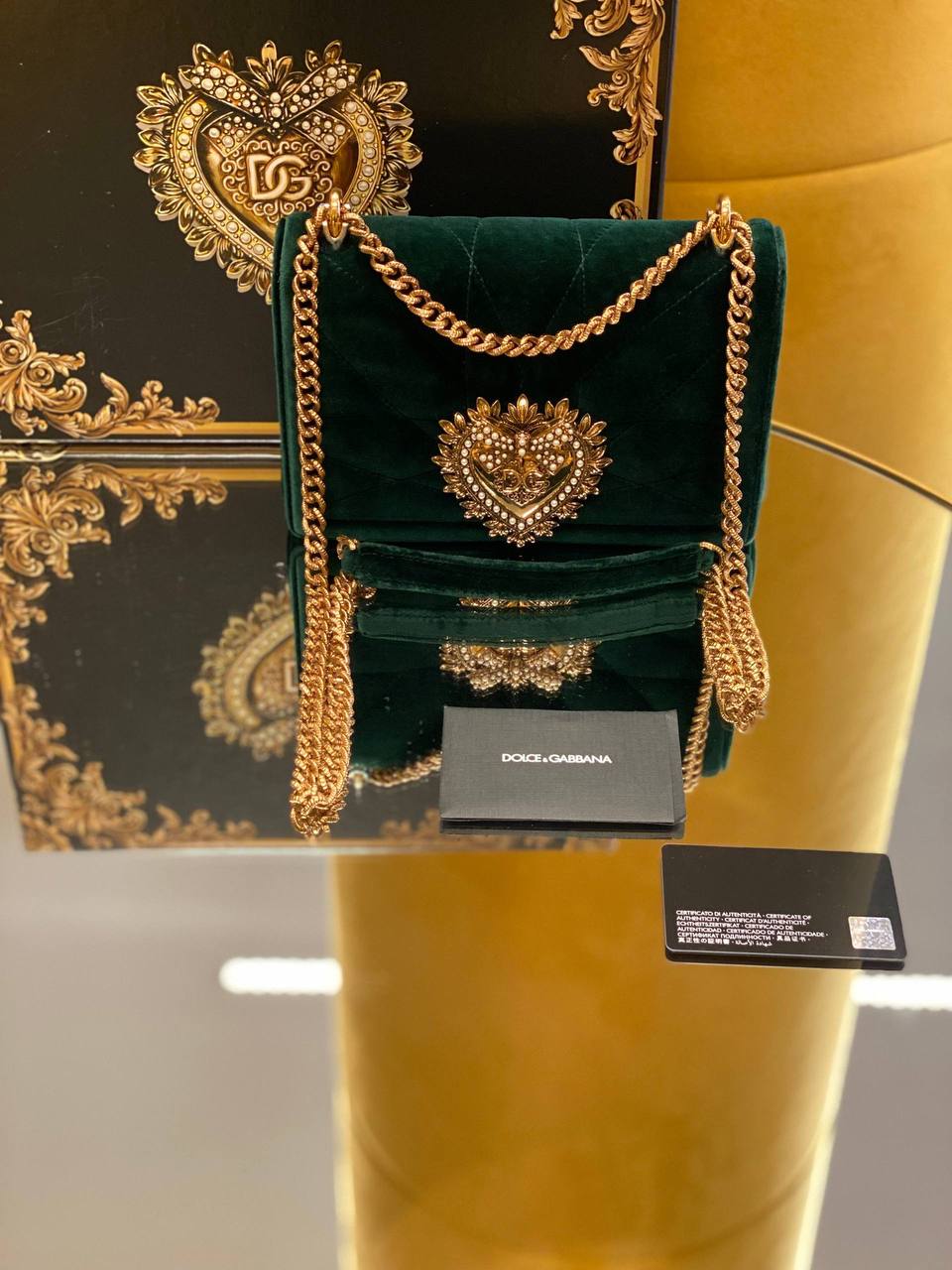 Элегантная женская сумка Dolce & Gabbana из бархата изумрудно-зеленого цвета с декоративной стежкой. Модель украшена массивной золотистой фурнитурой в форме сердца с логотипом DG и инкрустацией. Сумка дополнена длинным ремешком-цепочкой золотистого цвета. В комплекте поставляется фирменная коробка, конверт и карта аутентичности.