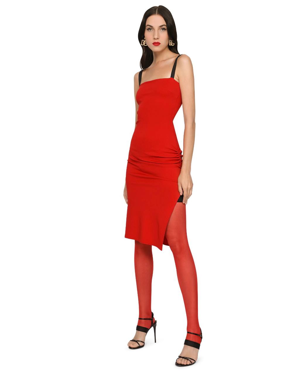 Элегантное облегающее платье миди ярко-красного цвета. Модель дополнена широкими контрастными черными бретелями с логотипом бренда. Платье имеет квадратный вырез, асимметричный крой подола с разрезом и декоративную драпировку на бедре, которая выигрышно подчеркивает силуэт. Состав: 75% вискоза, 20% полиамид, 5% эластан.
