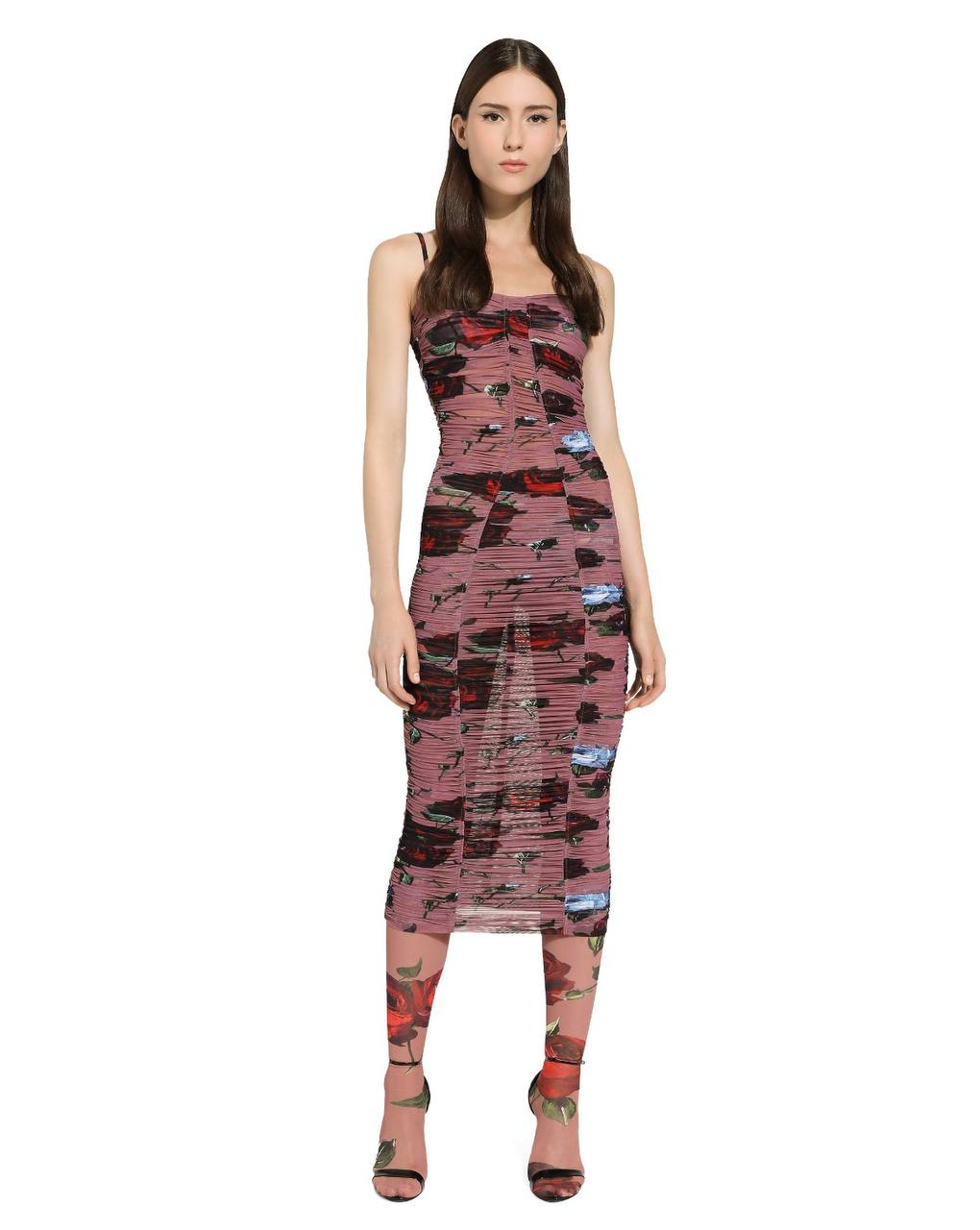 Элегантное облегающее платье миди на тонких бретелях, выполненное из легкой плиссированной ткани с эффектной драпировкой. Модель украшена контрастным цветочным принтом в виде роз на пыльно-розовом фоне. Образ дополнен высокими полупрозрачными колготками с аналогичным флористическим узором. Видимые логотипы отсутствуют. Состав: 92% полиэстер, 8% эластан.